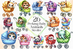 Stroll with this Peeking Baby Animals In Stroller Clipart Bundle, featuring adorable baby animal designs, perfect for nursery transportation crafts.