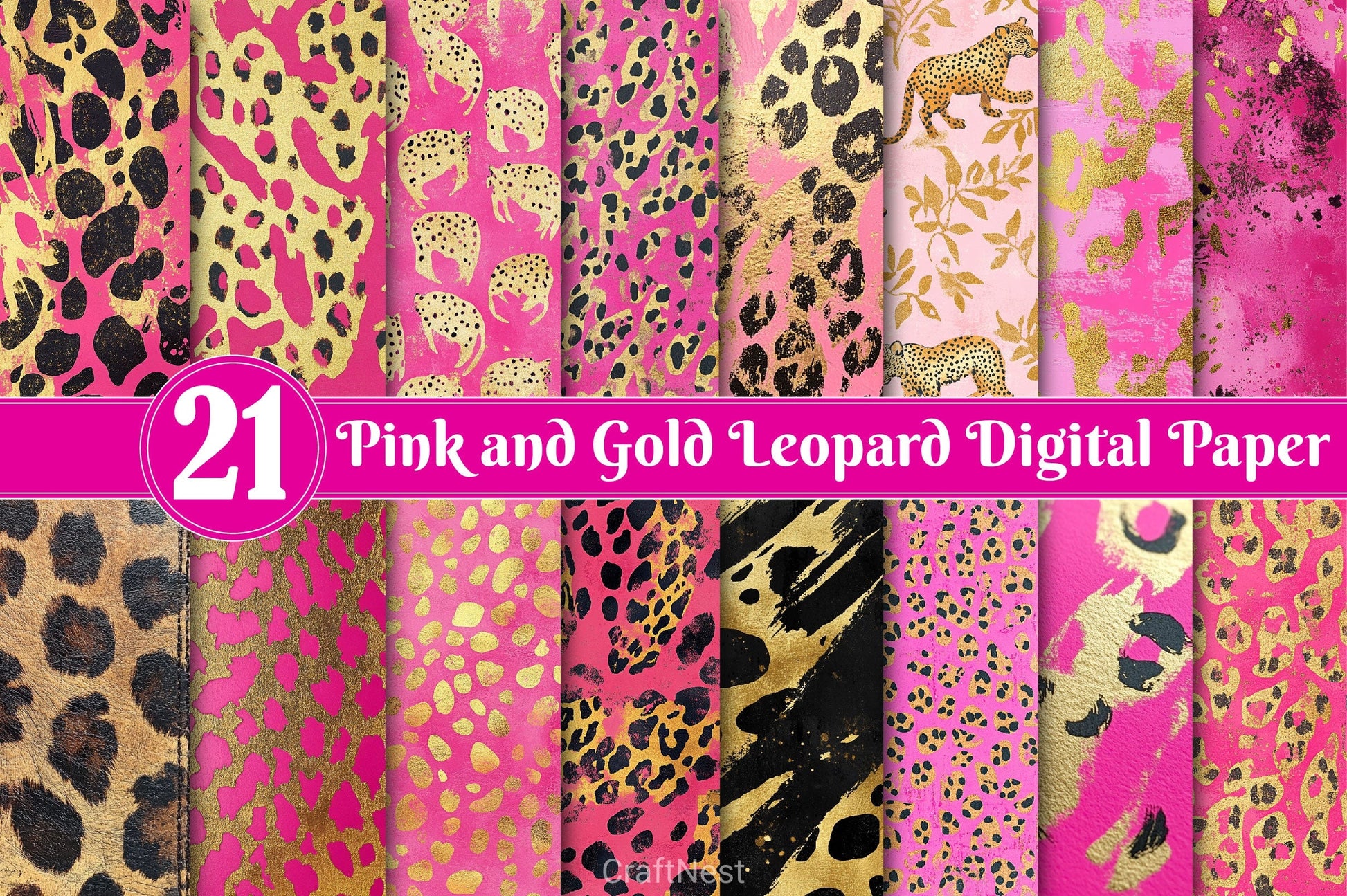 Glamorous pink and gold leopard digital papers perfect for wild and feminine crafting.