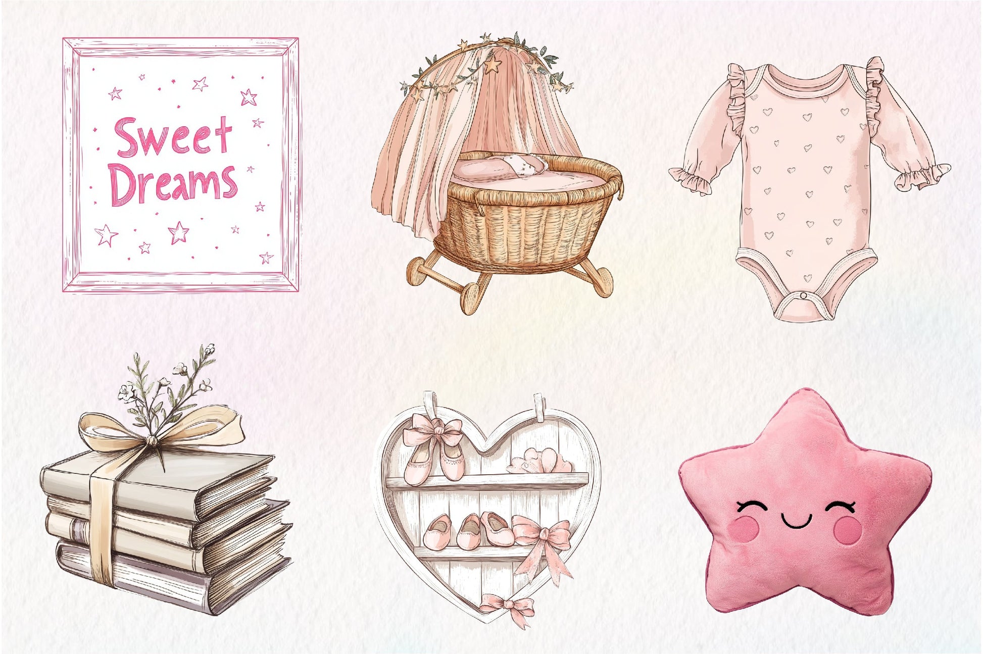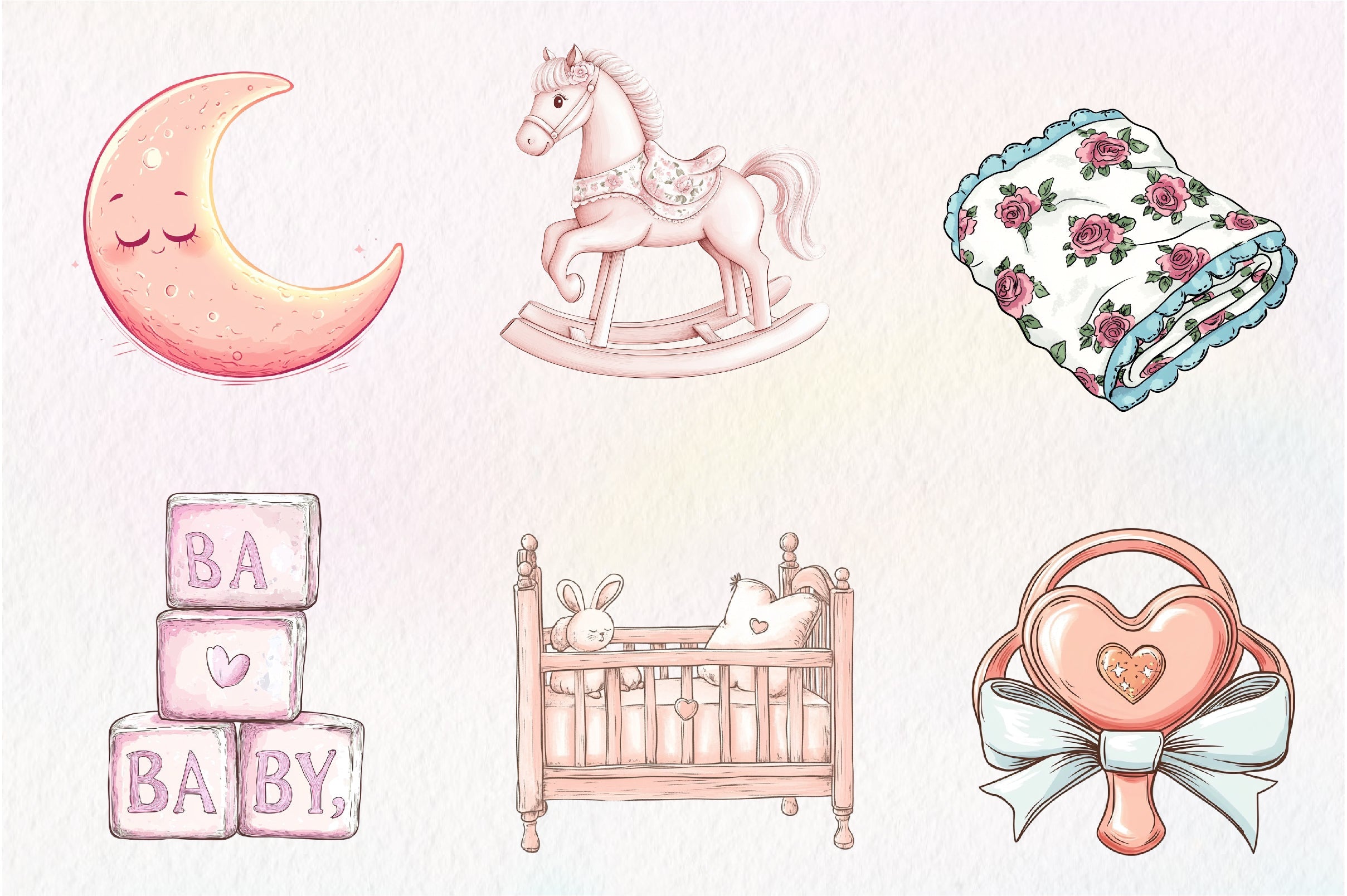 Nurture with this Pink Baby Girl Nursery Clipart Bundle, featuring baby girl designs, ideal for baby shower nursery crafts.
