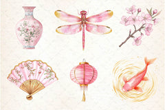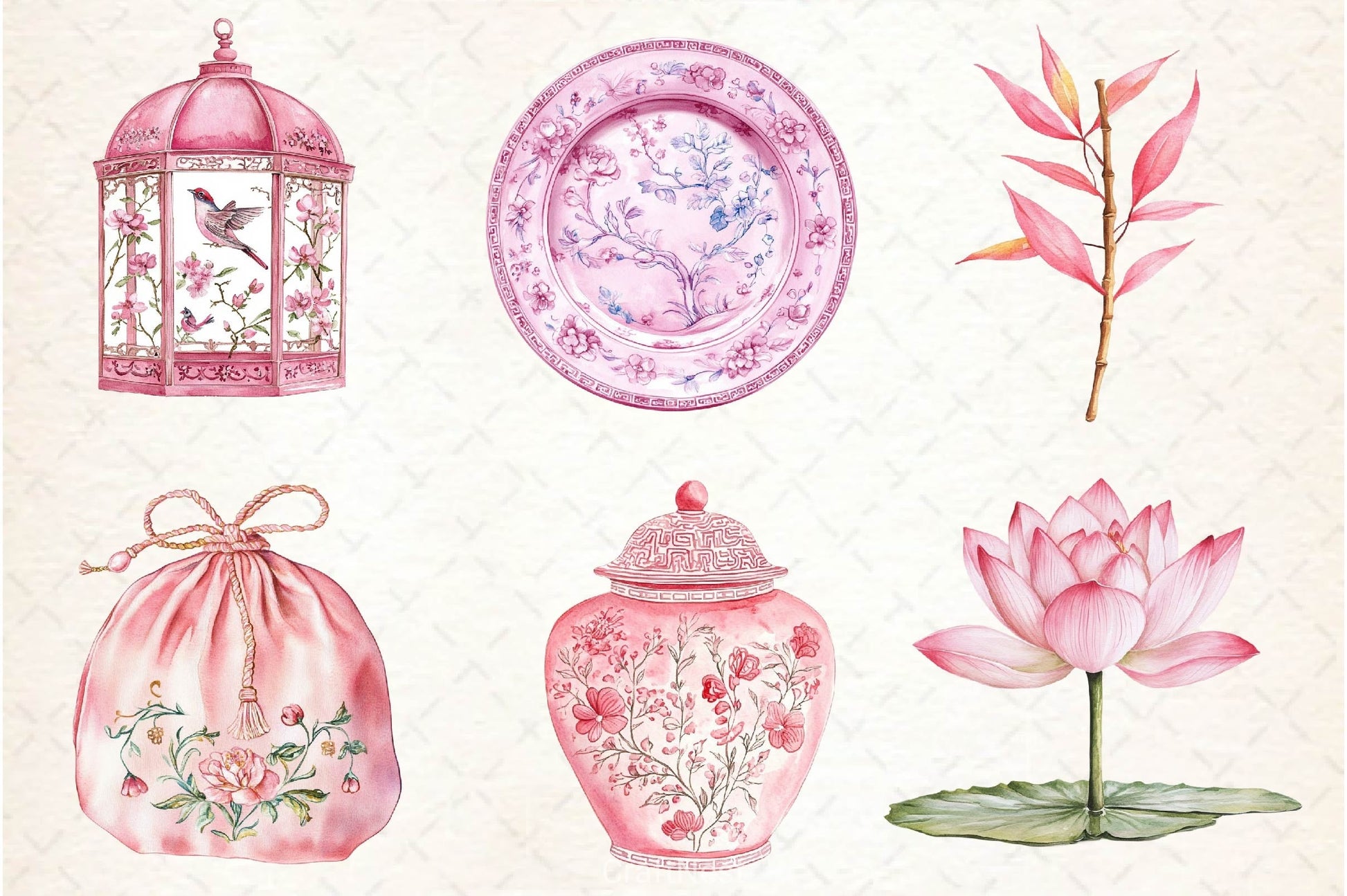 Oriental with this Pink Chinoiserie Summer Clipart Bundle, featuring Asian seasonal designs, perfect for cultural summer crafts.