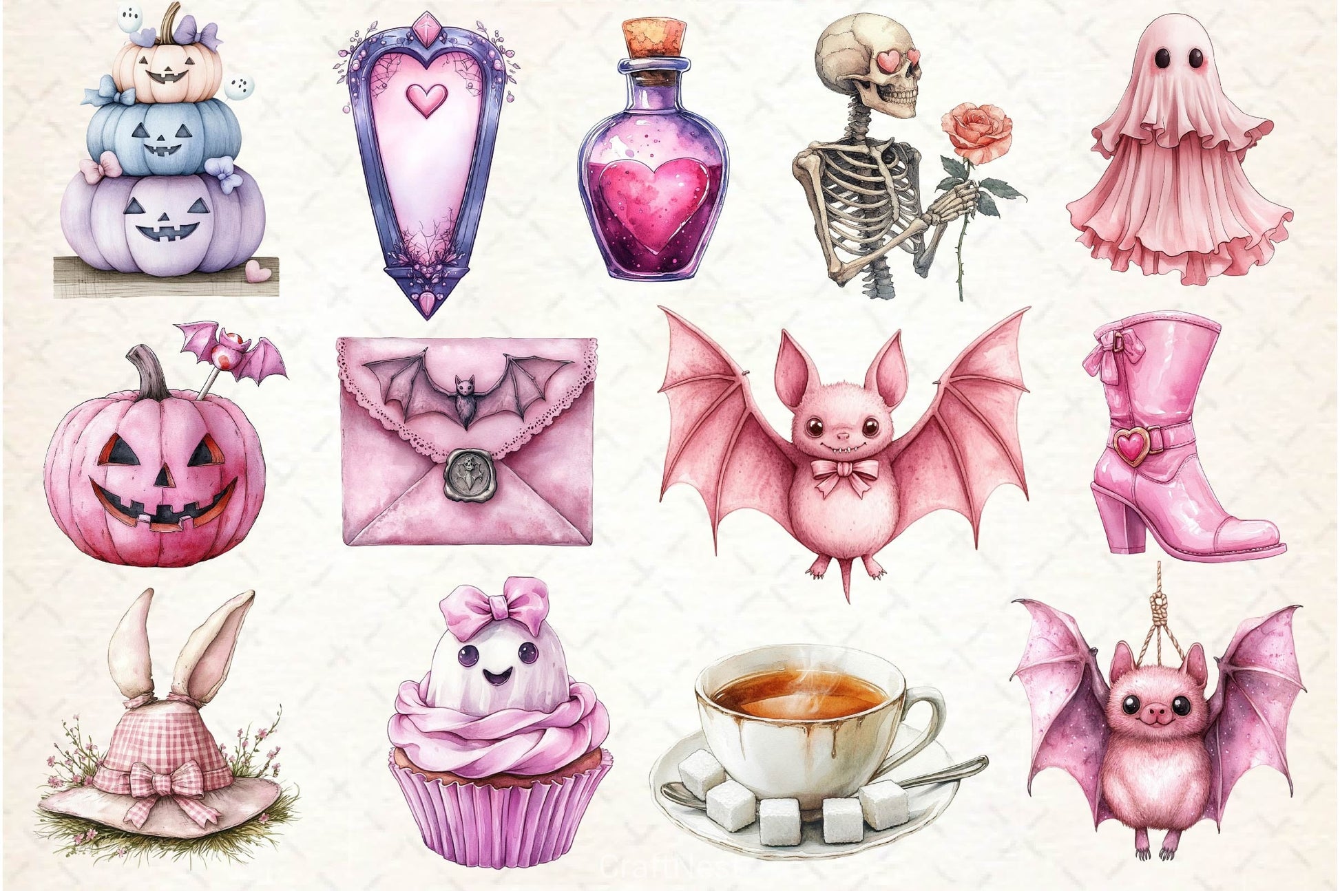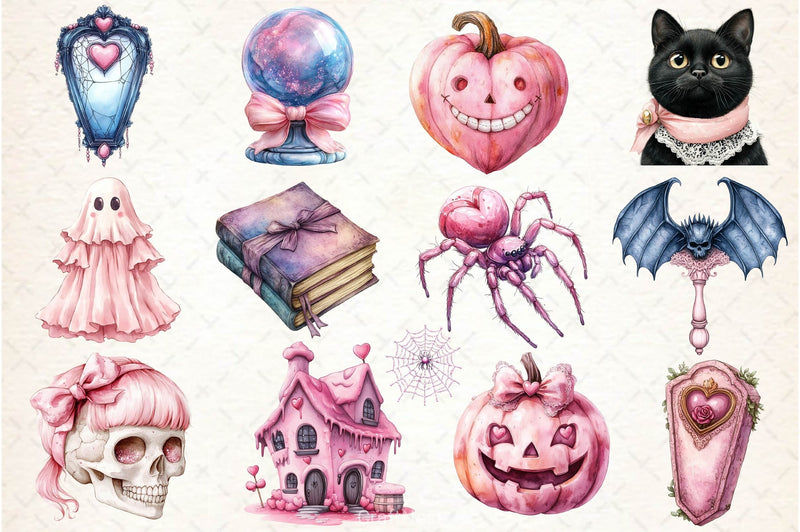 Feminine with this Pink Coquette Girly Halloween Clipart Bundle, featuring girly spooky designs, perfect for feminine Halloween crafts.