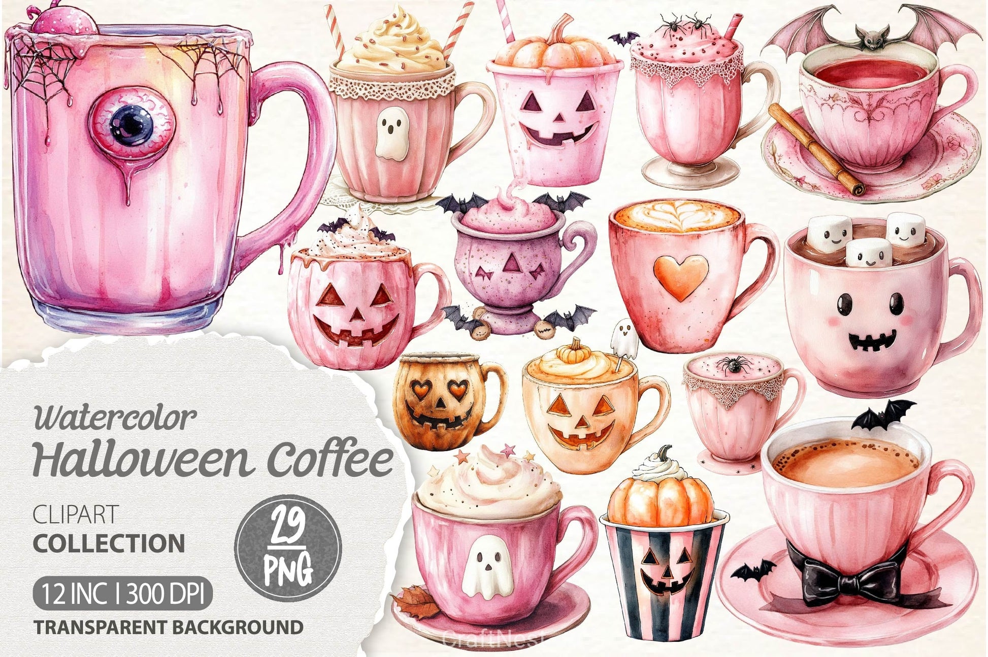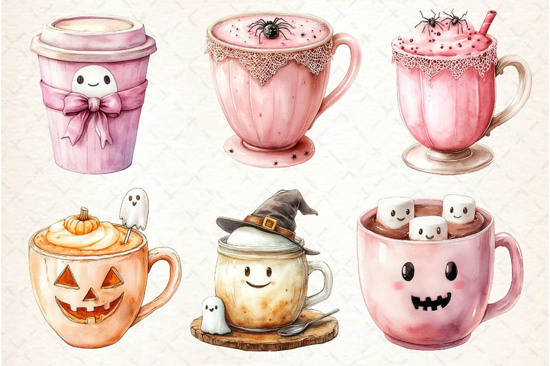 Brew with this Pink Coquette Halloween Coffee Clipart Bundle, featuring girly spooky beverage designs, perfect for feminine Halloween crafts.