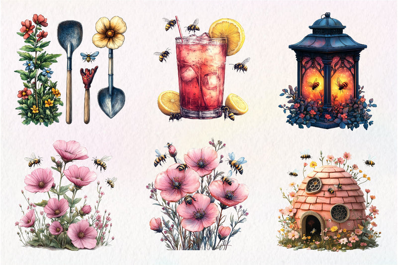 Buzz with this Pink Summer Bees Garden Clipart Bundle, featuring rosy bee designs, perfect for summer gardening crafts.