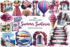 Vacation with this Pink Summer Santorini Travel Clipart Bundle, featuring Greek island designs, perfect for summer travel crafts.