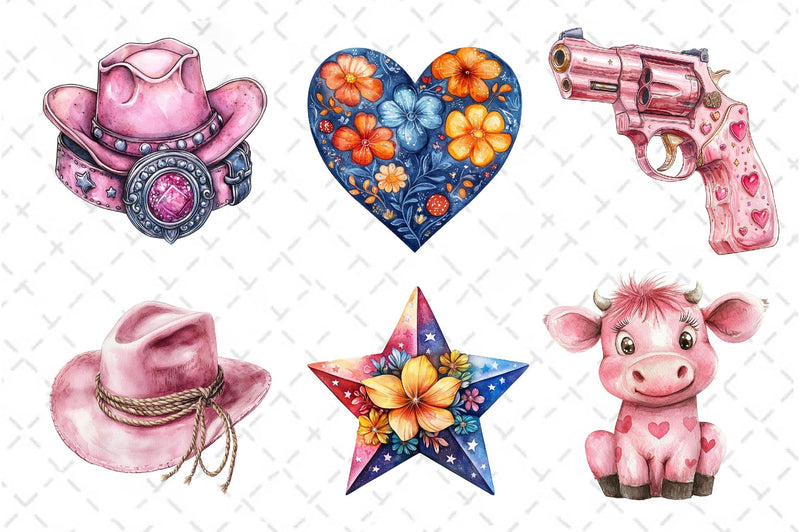 Vintage western elements in soft pink tones for cowgirl themed projects.