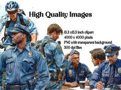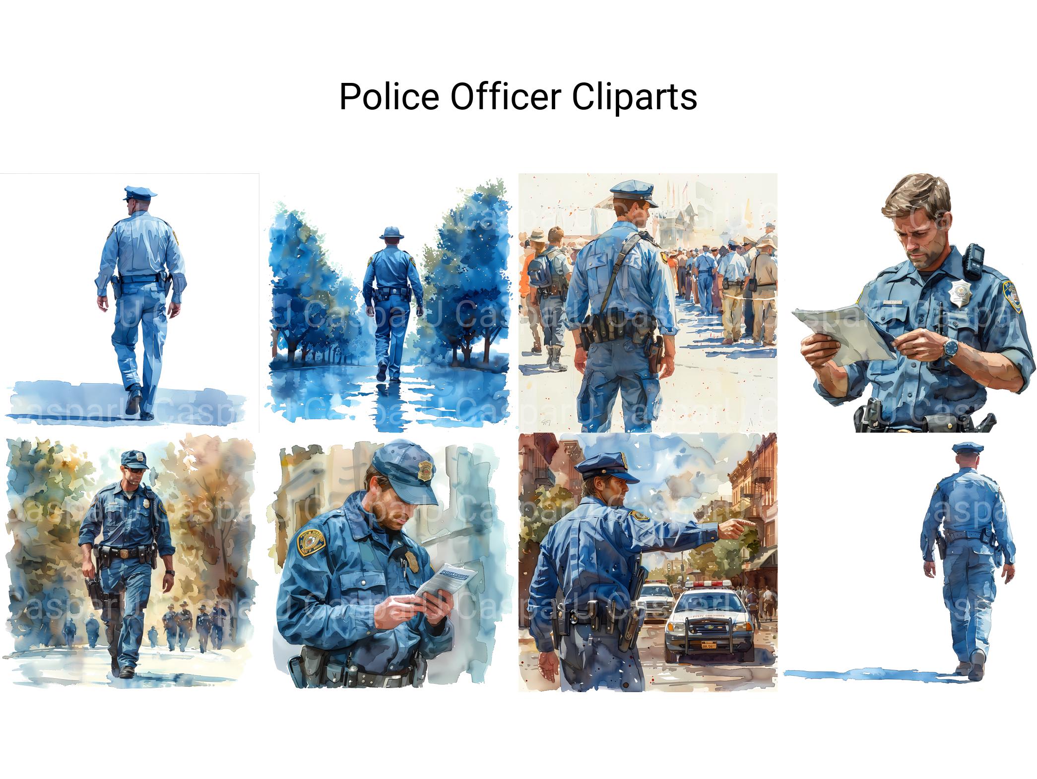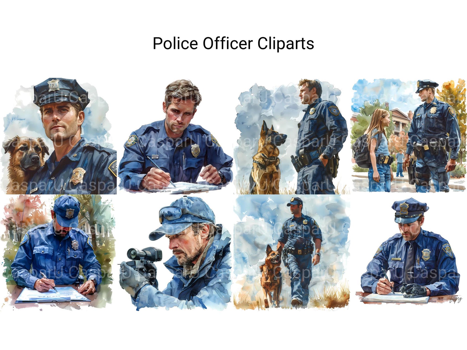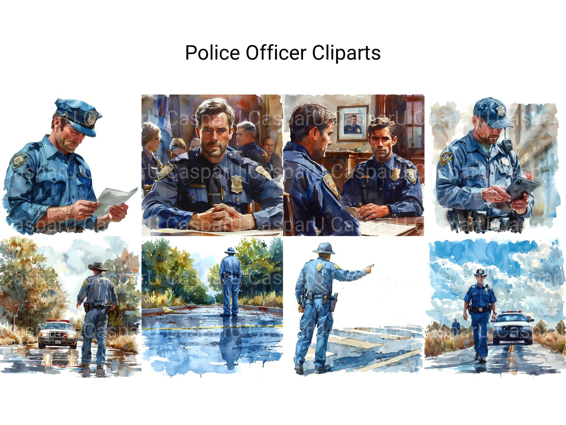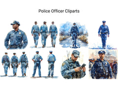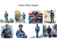 This police officer-themed digital clipart set includes badges, police cars, and crime scene elements. Ideal for law enforcement blogs, safety posters, and educational resources. These cliparts honor the dedication and service of police officers.