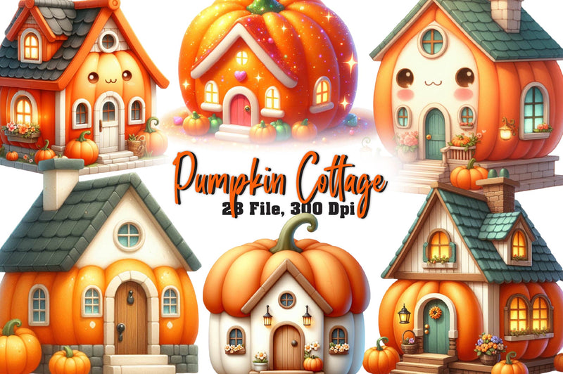 Cozy with this Pumpkin Cottage Clipart Bundle, featuring charming pumpkin house designs, ideal for autumn and Halloween crafts.