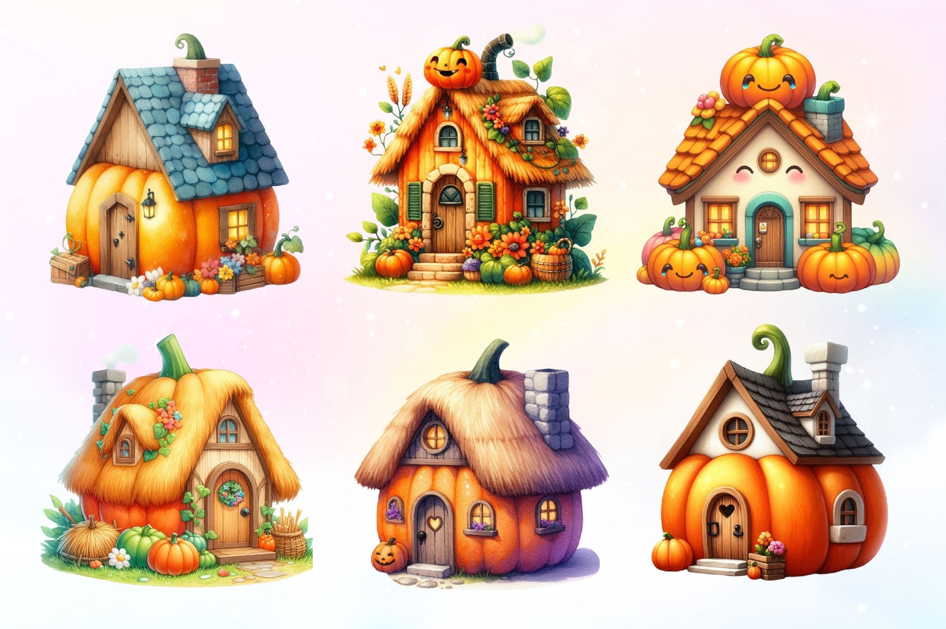 Dwell with this Pumpkin Cottage Clipart Bundle, featuring autumn home designs, perfect for fall living crafts.