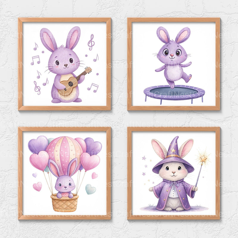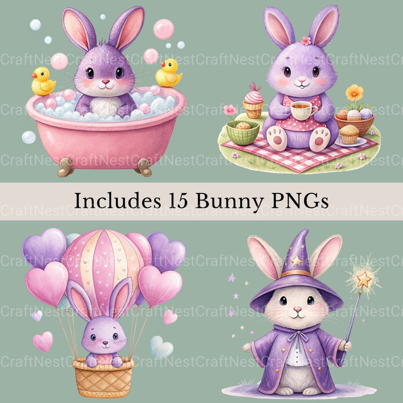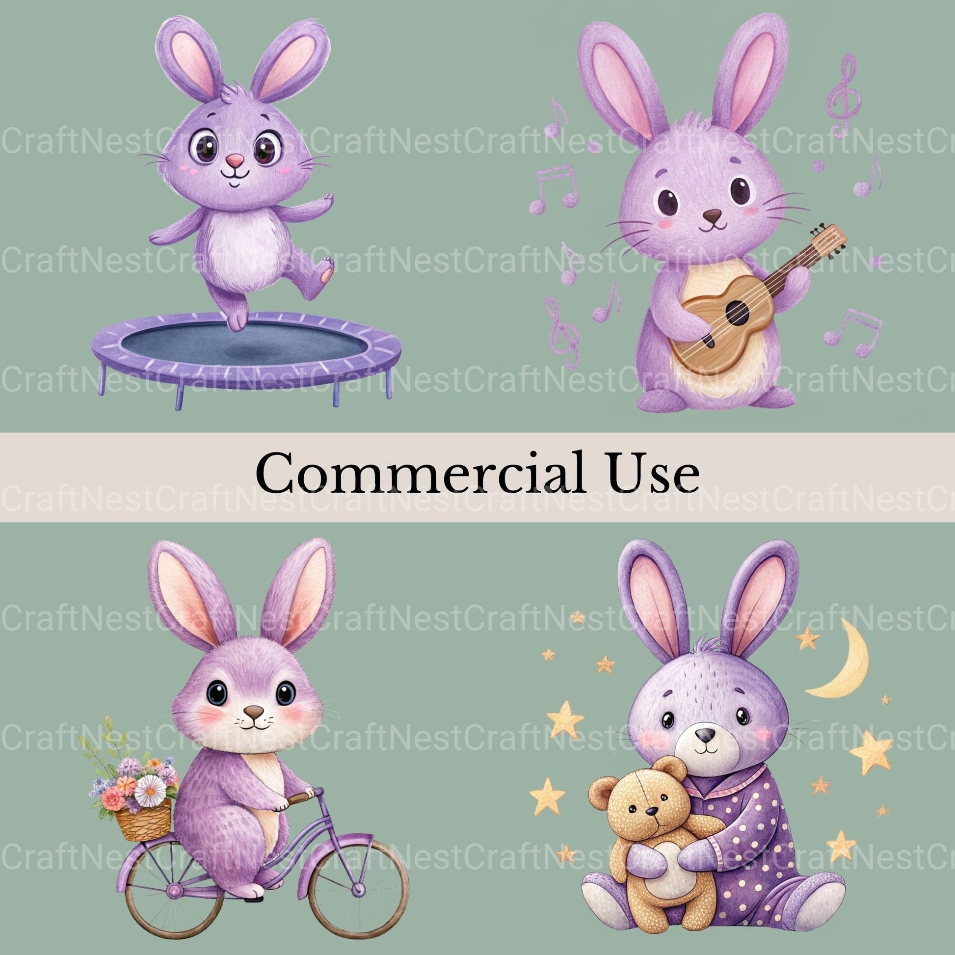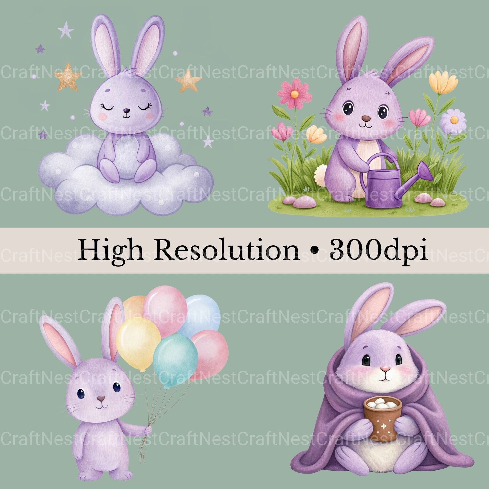Hop with this Purple Bunnies 15 Clipart Bundle, featuring purple bunny designs, ideal for color animal crafts.