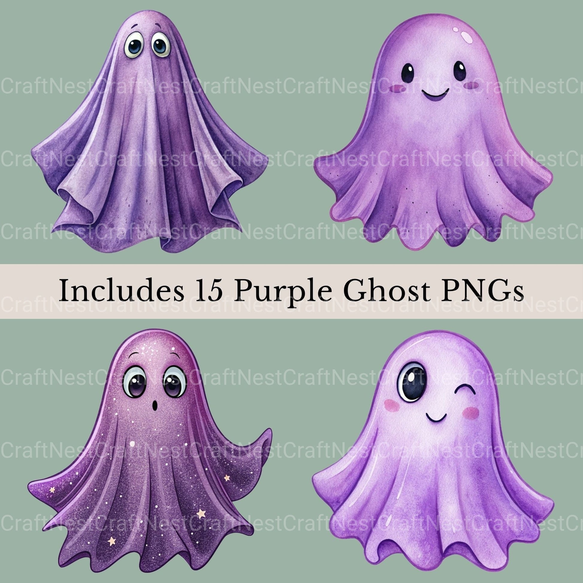 Boo with this Purple Ghosts 15 Clipart Bundle, featuring spooky purple ghost designs, perfect for Halloween color crafts.