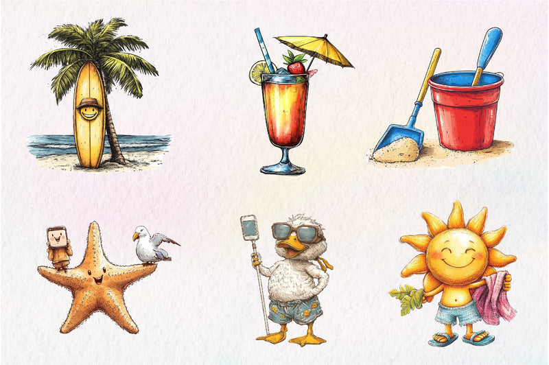 Play with this Quirky Summer Beach Day Clipart Bundle, featuring playful beach designs, perfect for summer kawaii crafts.