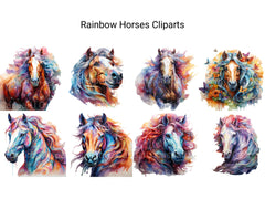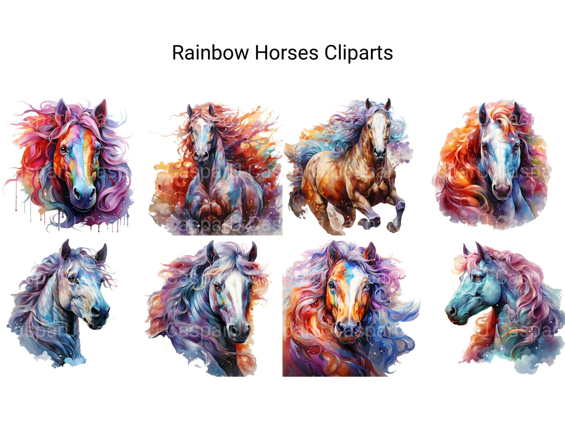 Gallop into a realm of vibrant hues with our Rainbow Horses clip art. These whimsical digital illustrations feature horses adorned with colorful rainbow patterns, their coat shimmering with every hue of the rainbow, perfect for adding a touch of chromatic wonder and joyful energy to your designs, whether for fantasy artwork, rainbow-themed creations, or magical adventures, celebrating the kaleidoscopic beauty and radiant spirit of rainbow horses in delightful detail.