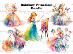 Journey into a world of royal splendor with our Rainbow Princesses clip art. These majestic digital illustrations feature princesses with rainbow gowns, sparkling crowns, and radiant smiles, spreading joy and magic wherever they go, perfect for adding a colorful and enchanting touch to your designs, fit for royalty of all ages.