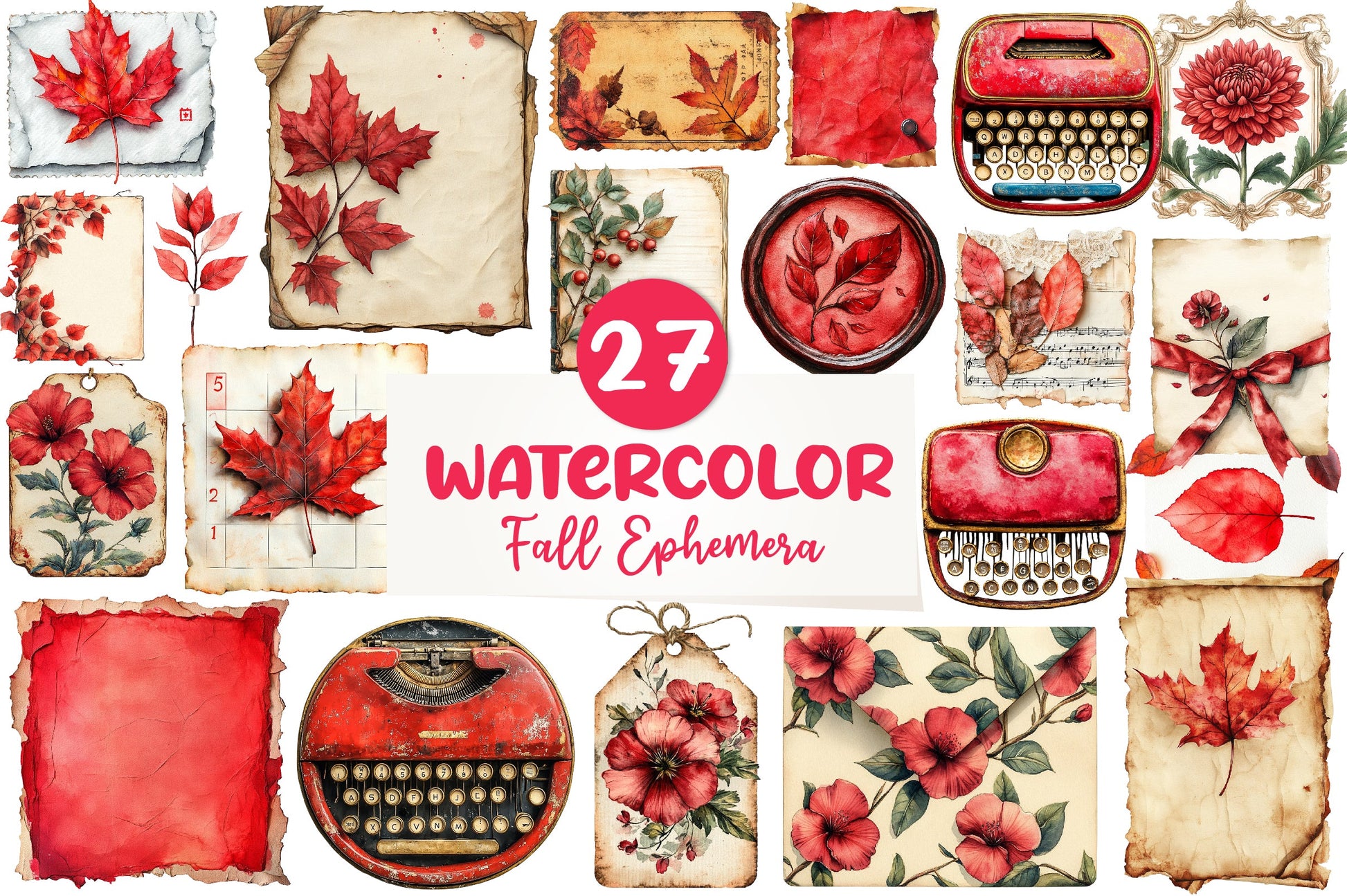 Collect with this Red Vintage Fall Ephemera Clipart Bundle, featuring red autumn collectibles, ideal for vintage fall crafts.