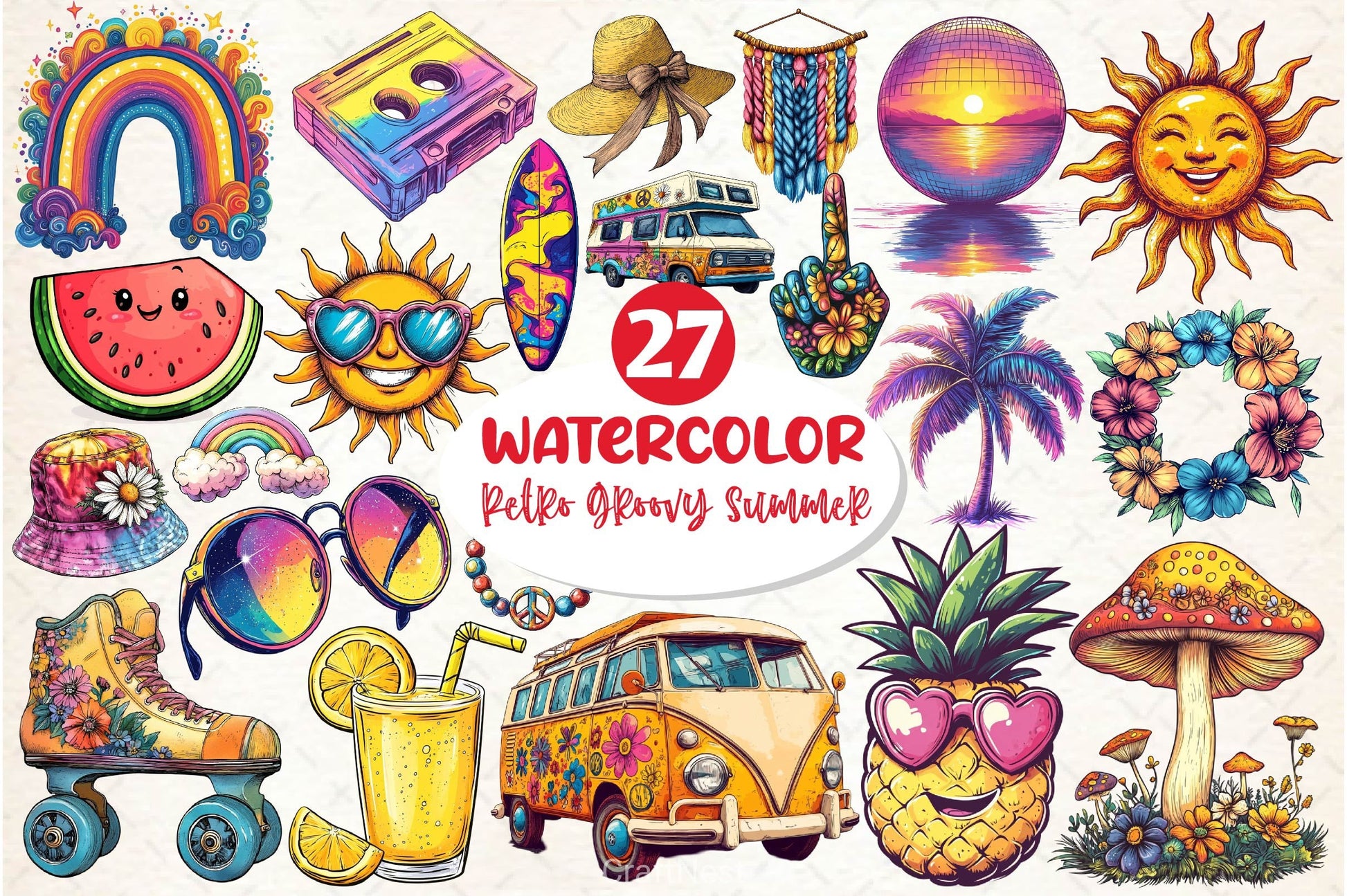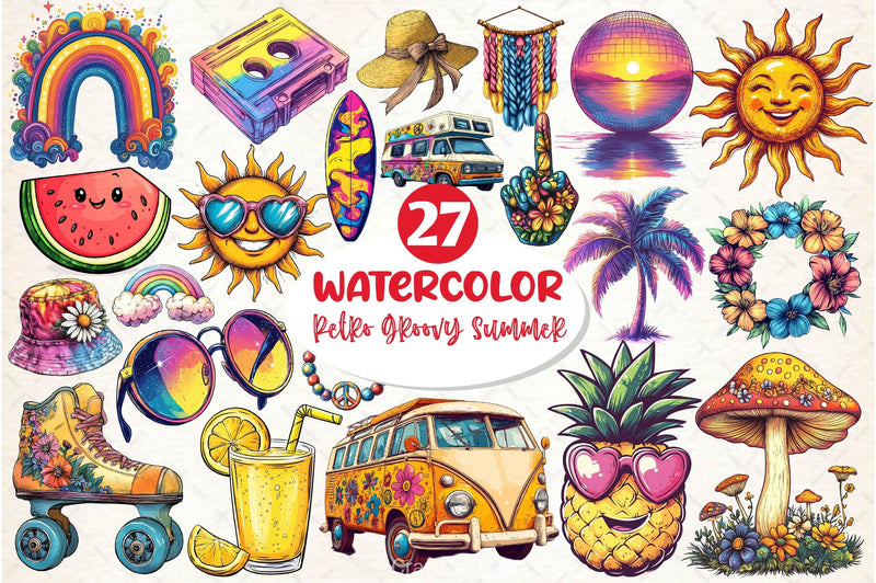 Groovy retro summer designs with vintage 70s seasonal vibes.