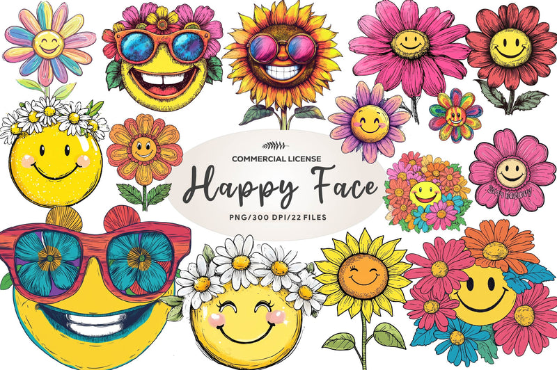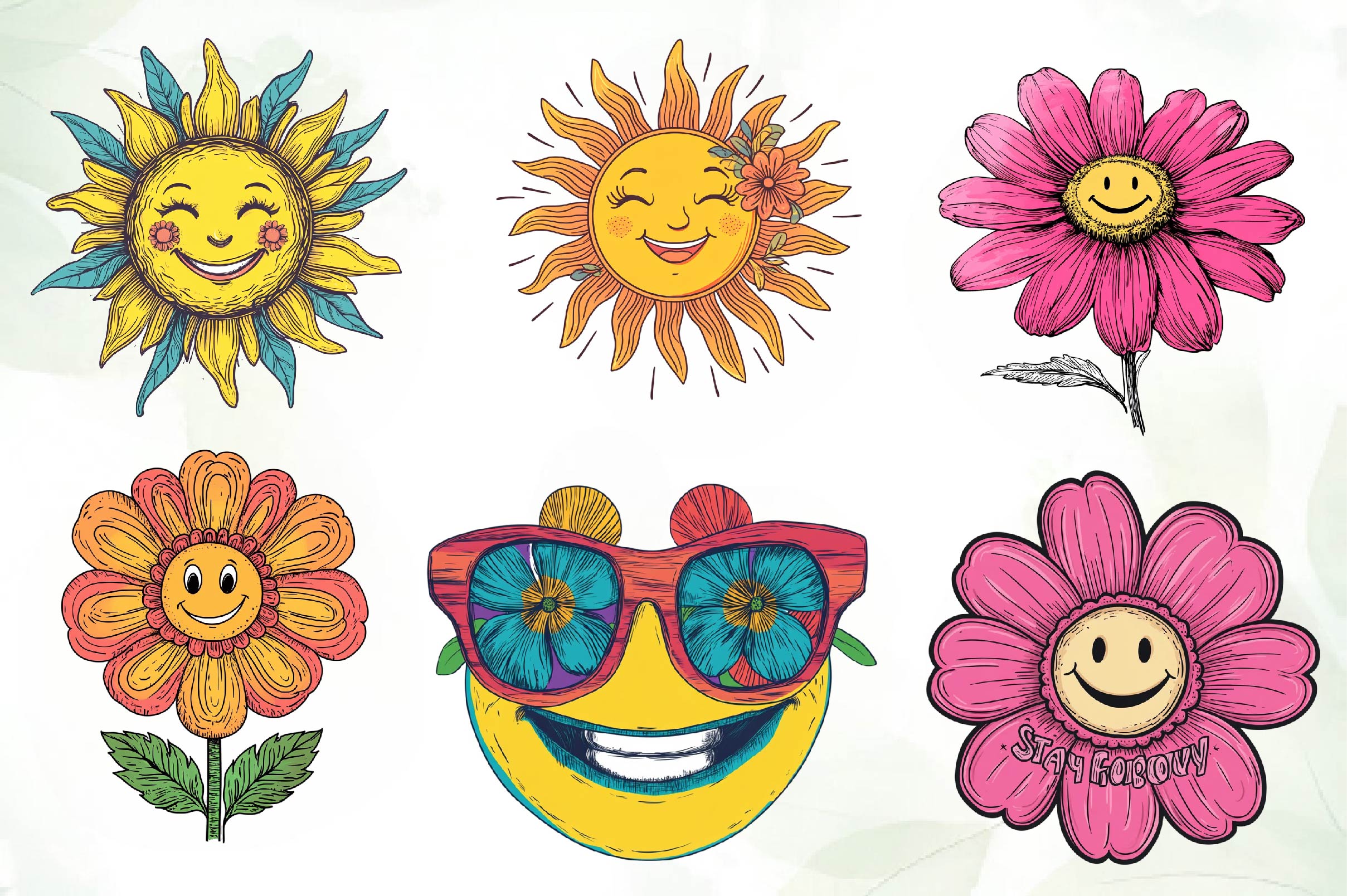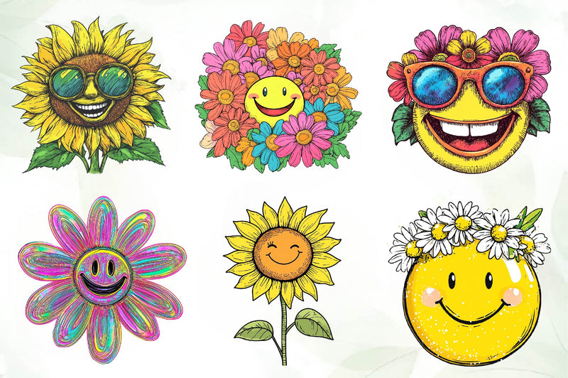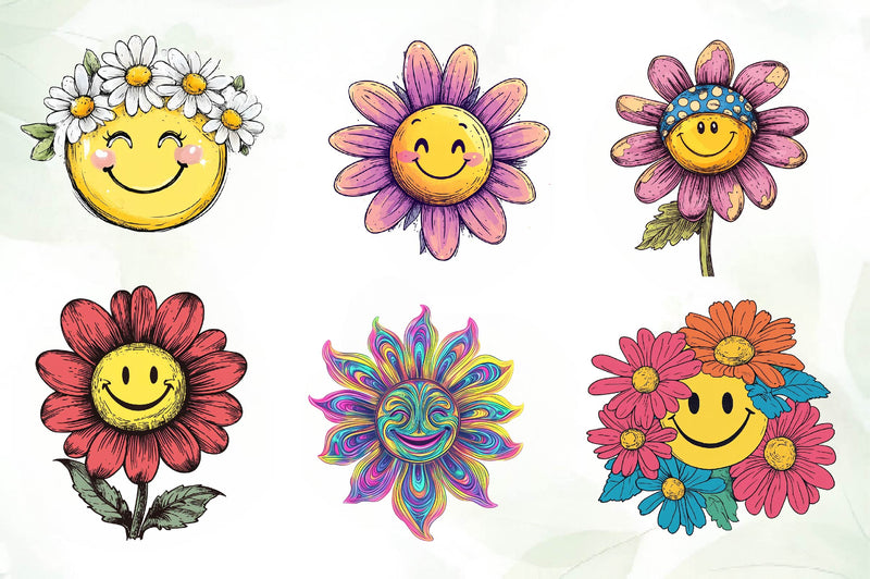 Smile with this Retro Happy Face Floral Clipart Bundle, featuring cheerful flower designs, perfect for vintage floral crafts.