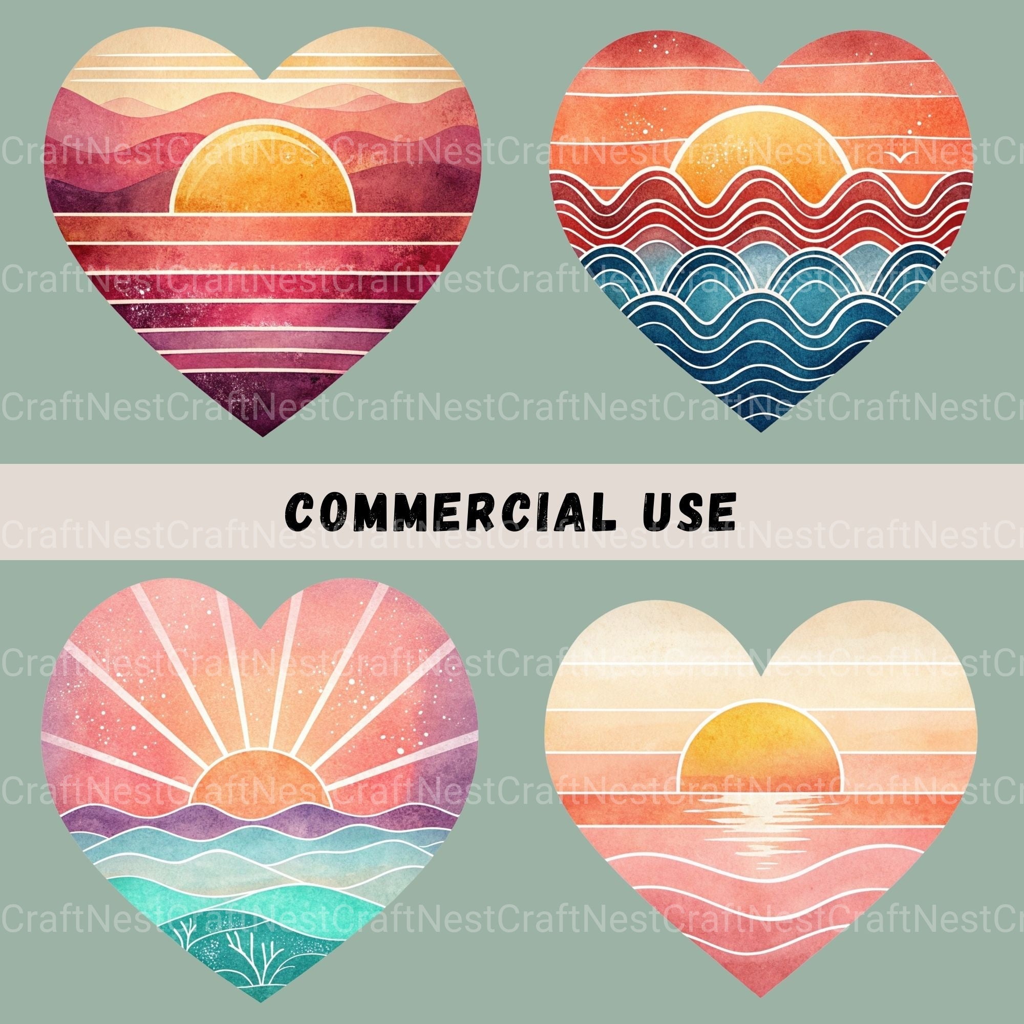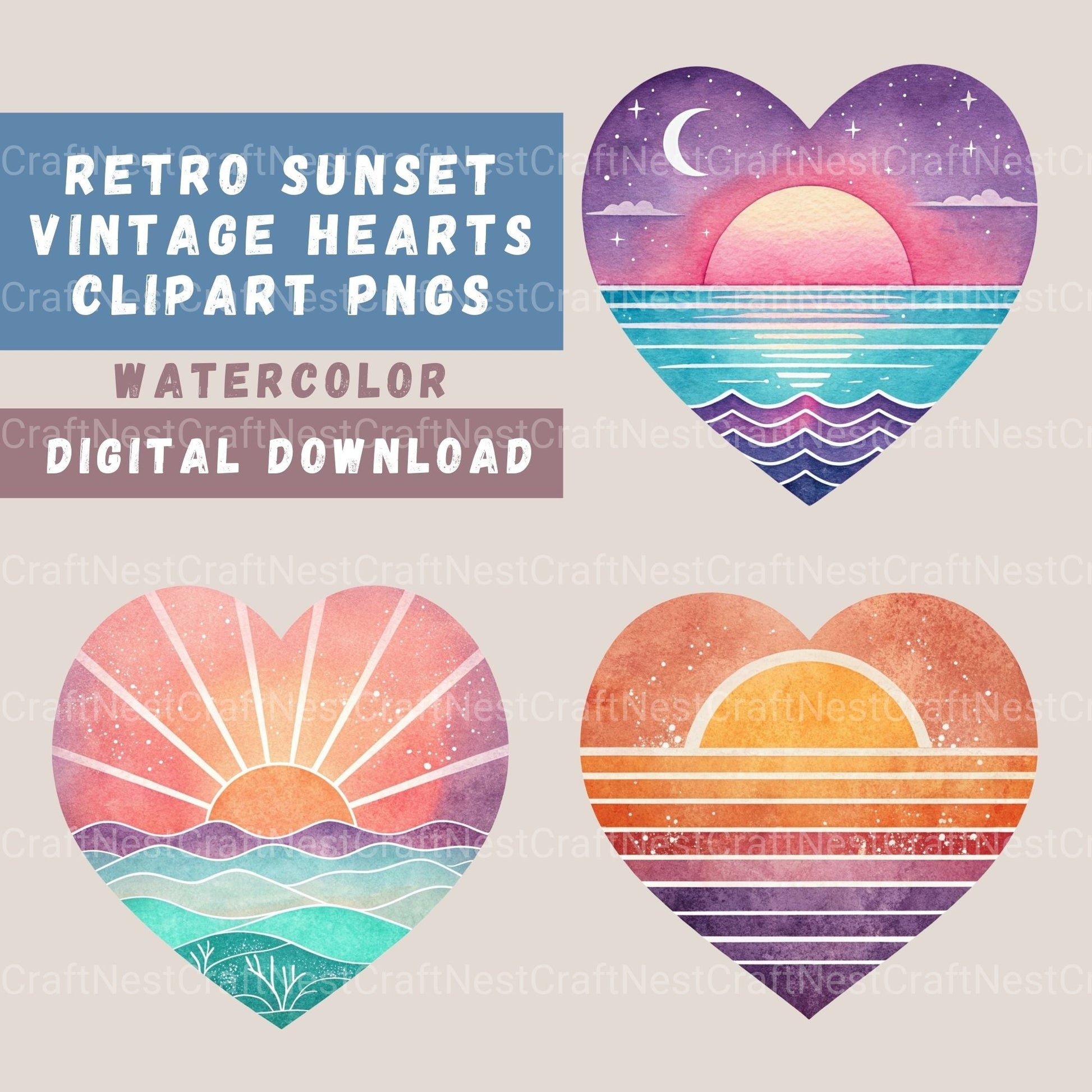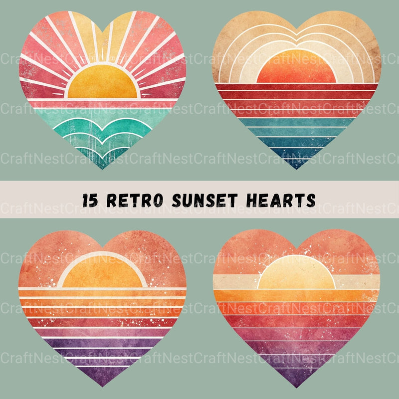 Love with this Retro Sunset Hearts 15 Clipart Bundle, featuring vintage sunset heart designs, perfect for vintage valentine crafts.