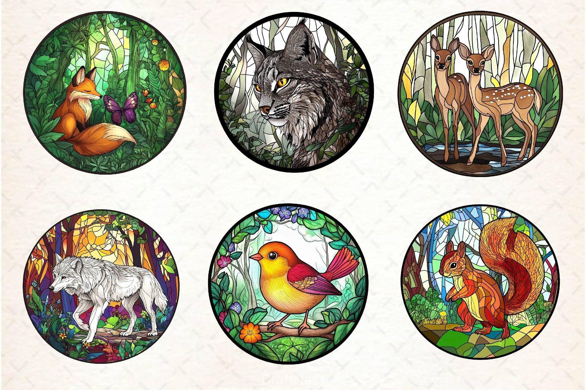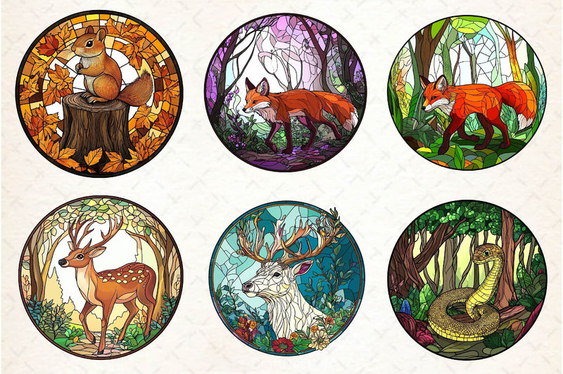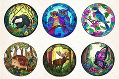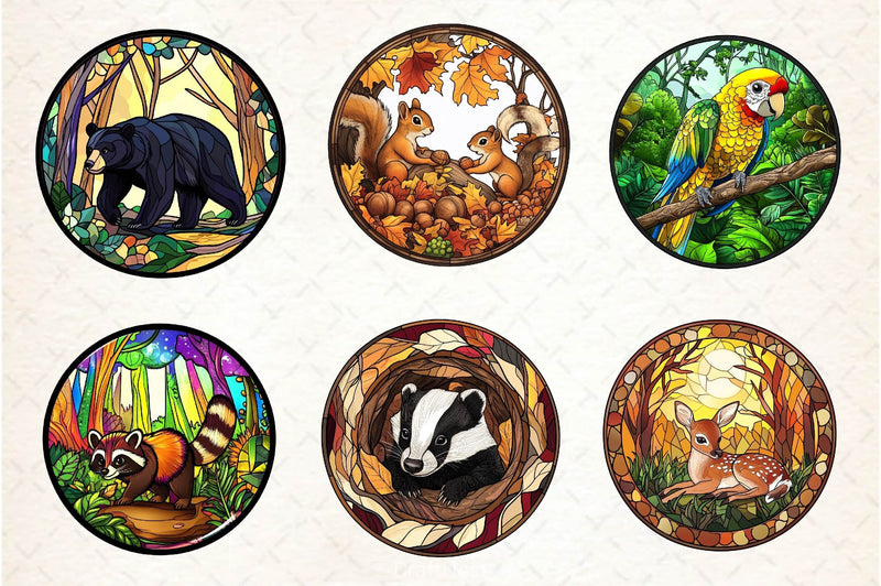 Round Stained Glass Forest Animals Clipart Bundle 2