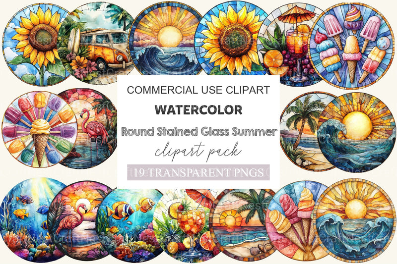 Shine with this Round Stained Glass Summer Clipart Bundle, featuring artistic summer designs, perfect for elegant seasonal crafts.