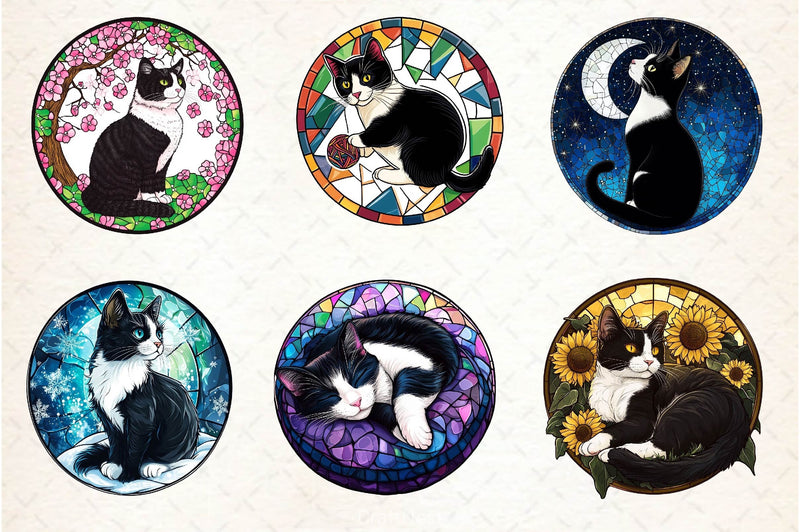 Round Stained Glass Tuxedo Cat Clipart Bundle 2