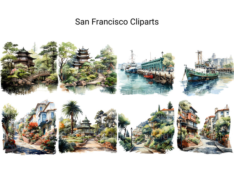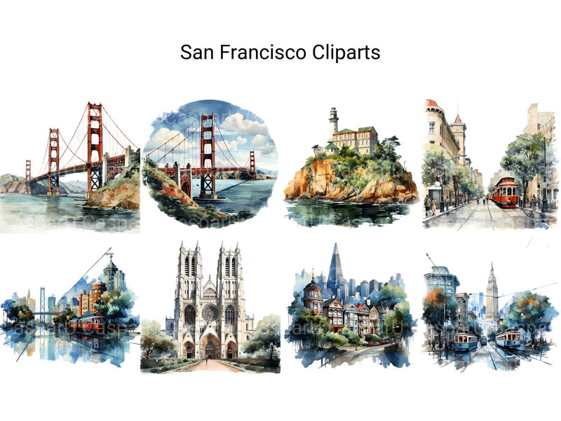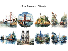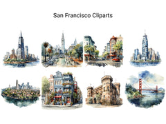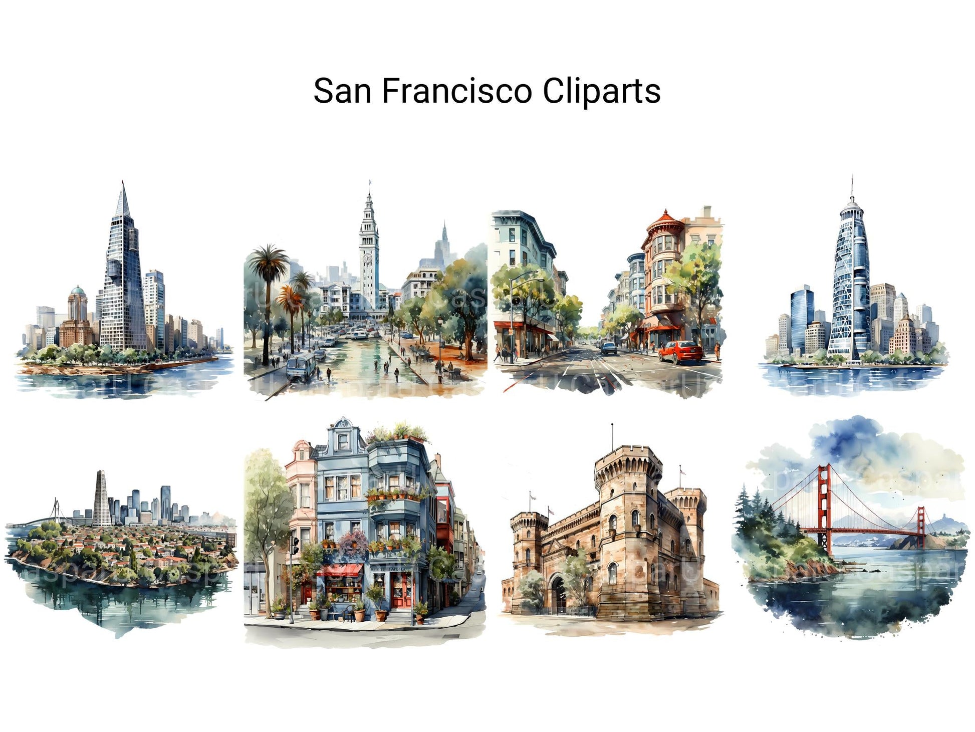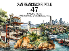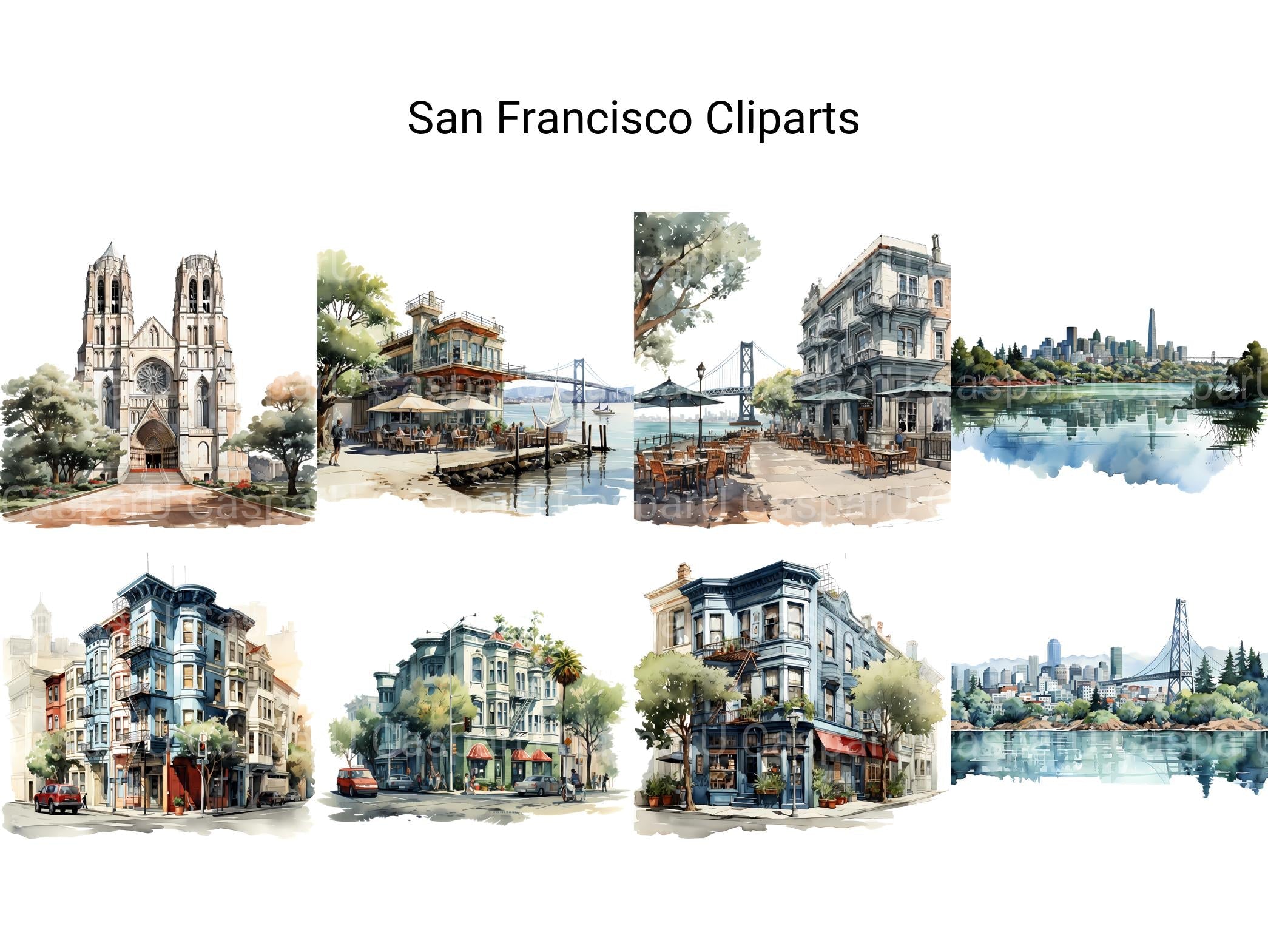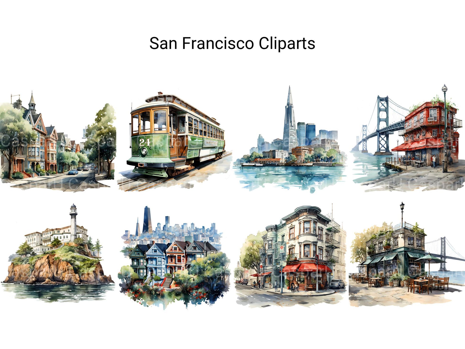 Explore the vibrant charm of San Francisco with digital clip art featuring its iconic landmarks, such as the Golden Gate Bridge and Alcatraz Island, along with its picturesque neighborhoods and cable cars. These illustrations capture the eclectic energy and cultural diversity of the city, perfect for adding a touch of West Coast allure to your projects, whether for travel brochures, city guides, or artistic designs.