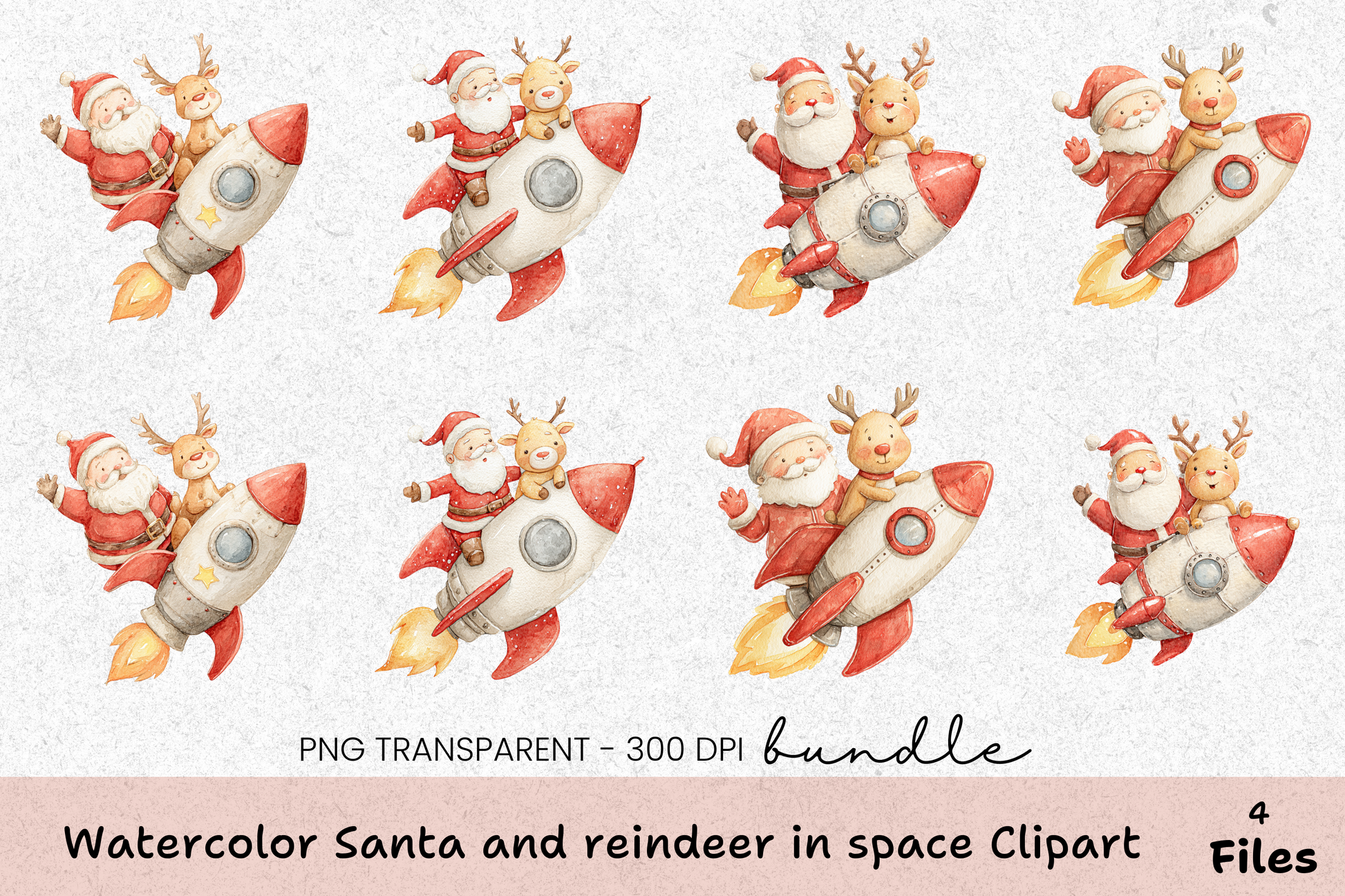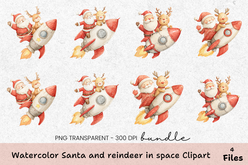 Explore the cosmos with our Santa and Reindeer in Space Clipart Bundle, featuring whimsical designs perfect for festive projects and holiday crafts. Ignite your creativity with these unique illustrations, ideal for Christmas cards, party invitations, and digital scrapbooking. Elevate your seasonal designs with this enchanting collection, capturing the magic of Santa and his reindeer on a cosmic adventure.