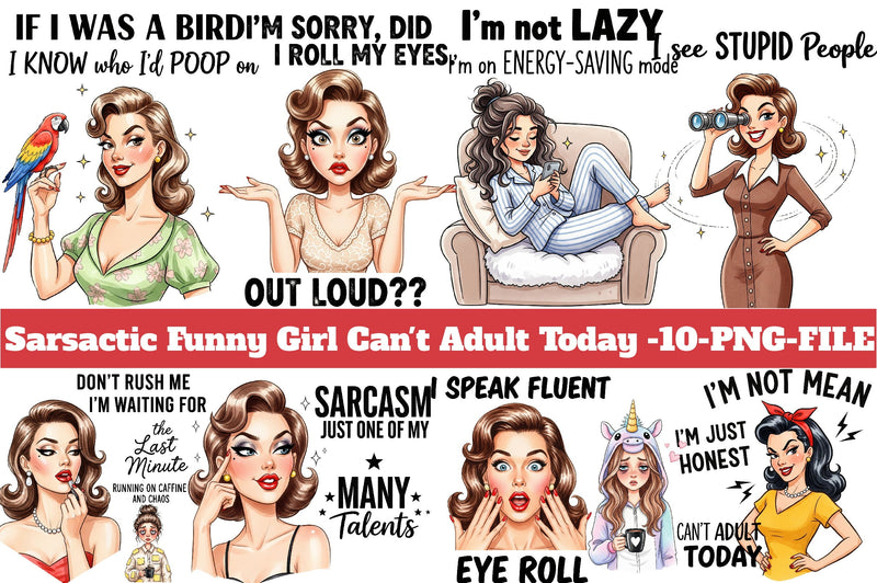 Unleash your humor with the Sarcastic Funny Girl Can't Adult Today Clipart Bundle, perfect for adding a playful twist to your creative projects. This collection features quirky, relatable designs that resonate with anyone who needs a break from adulting. Ideal for crafting hilarious greeting cards, personalized gifts, or unique social media content, these cliparts are your go-to for injecting fun into any project. Embrace the chaos and let your creativity shine with this must-have bundle for every humor enthusiast.