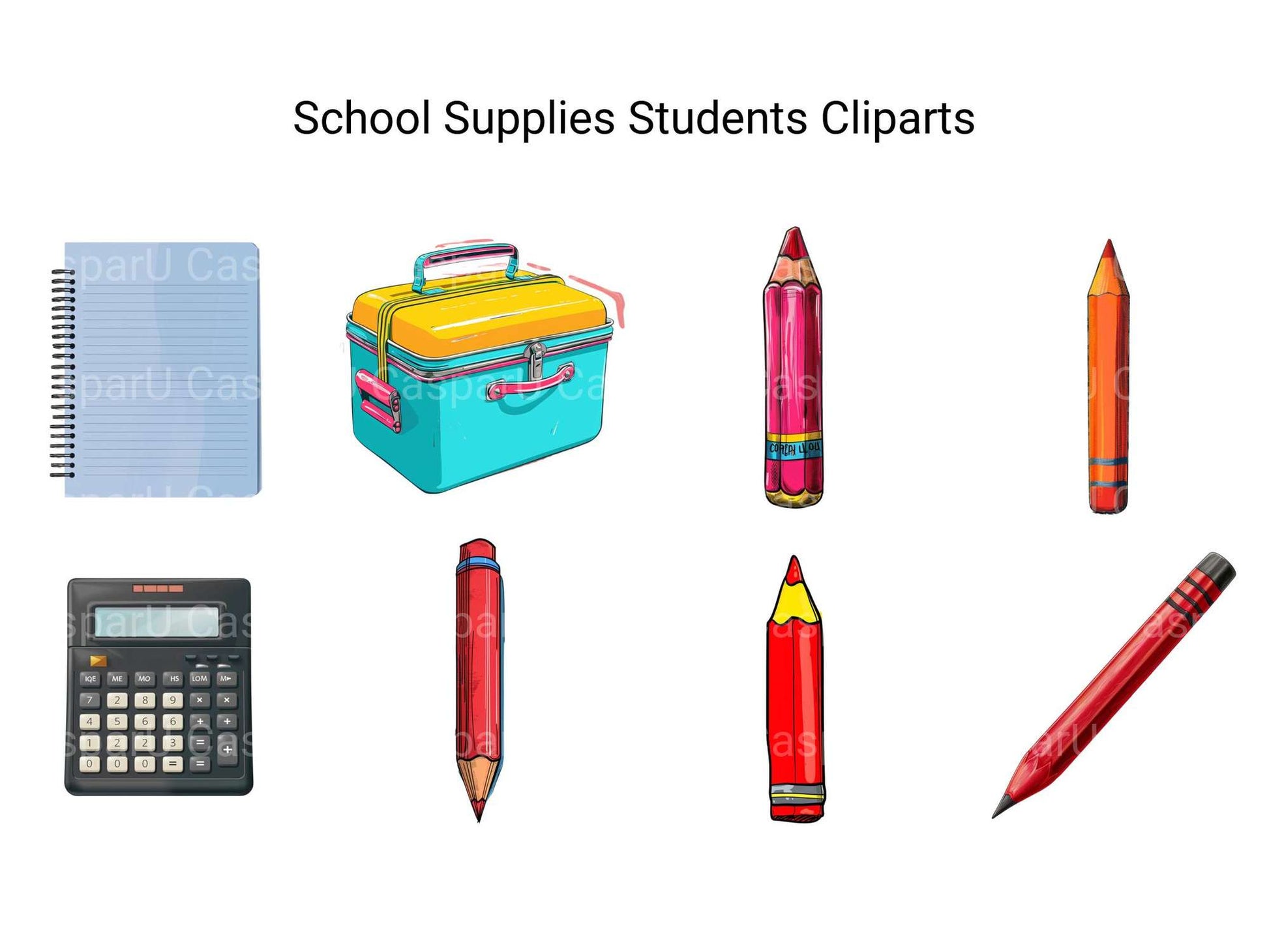 Stock up with this School Supplies Clipart set, featuring classroom essentials, ideal for school-themed crafts.