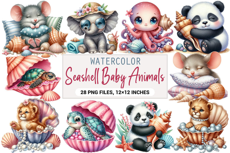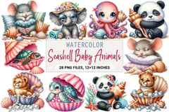 Transform your projects with our Seashell Baby Animals Clipart Bundle, showcasing adorable baby animals in seashells, perfect for scrapbooking, invitations, and more.