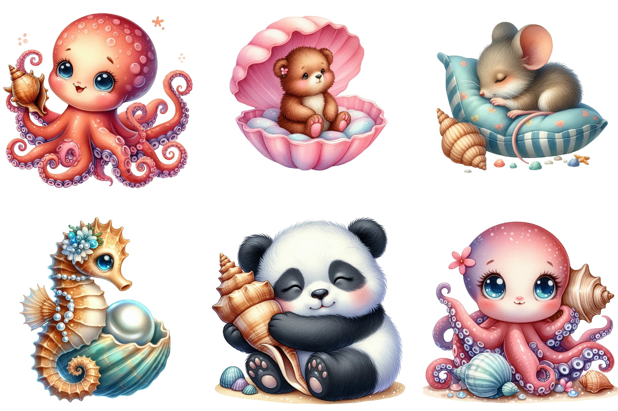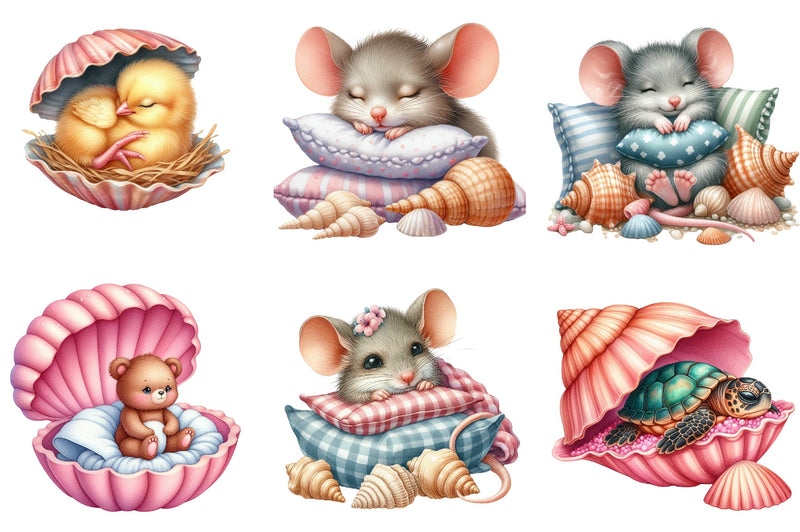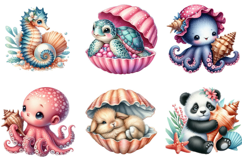 Unleash creativity with our enchanting Seashell Baby Animals Clipart, offering a variety of cute and cuddly creatures, ideal for personalized gifts and DIY crafts.