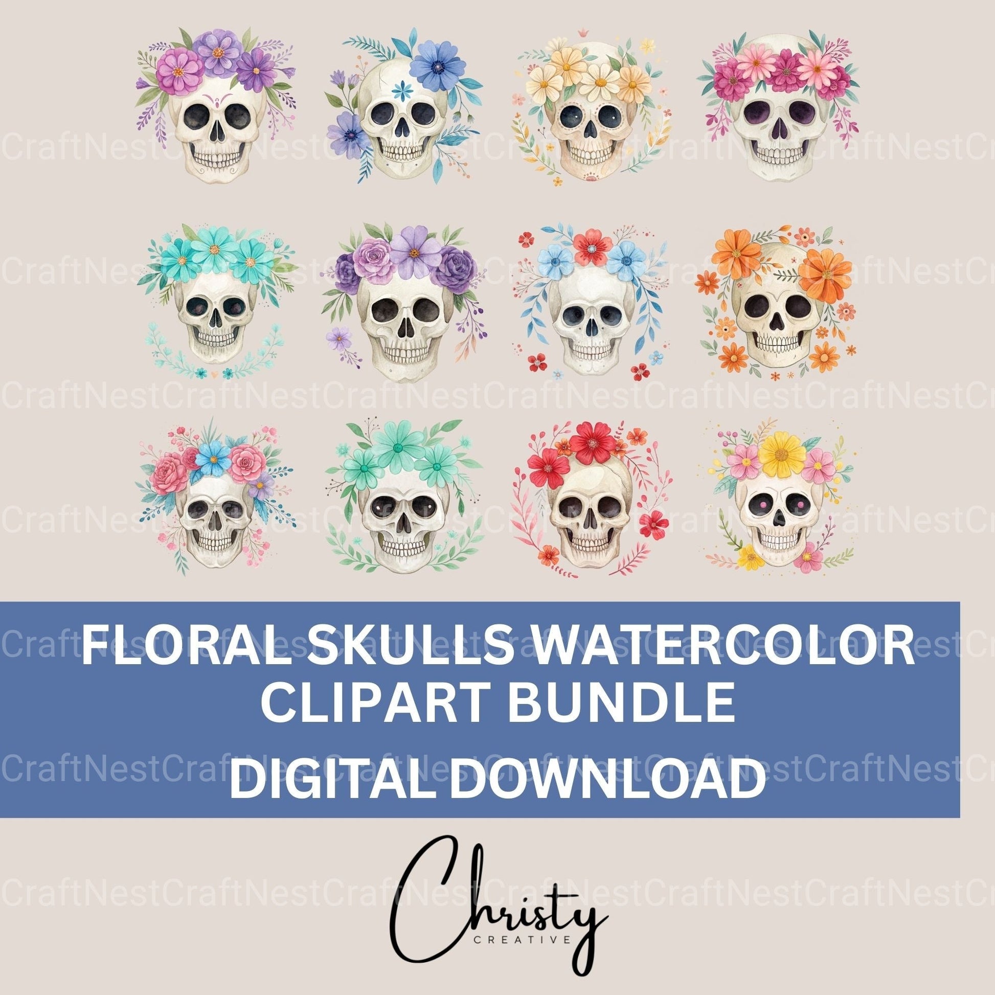 Bloom with this Skulls Floral 12 Clipart Bundle, featuring floral skull designs, perfect for gothic flower crafts.