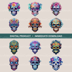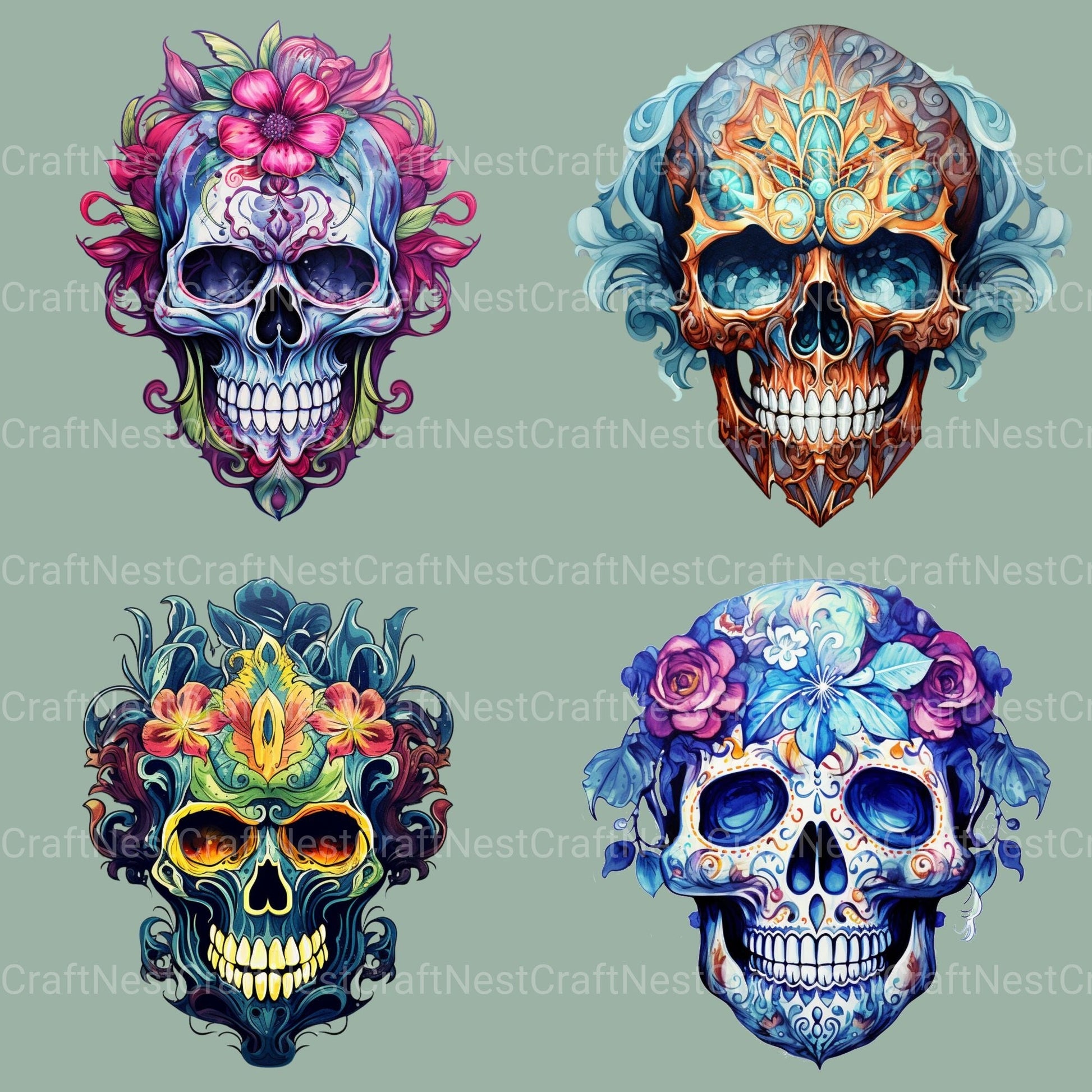 Decorate with this Skulls Ornamental 12 Clipart Bundle, featuring ornamental skull designs, perfect for gothic celebration crafts.