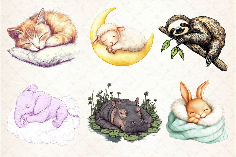 Peaceful sleeping animal designs perfect for bedtime and nursery projects.