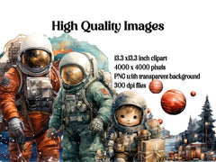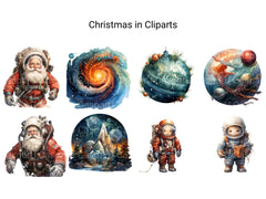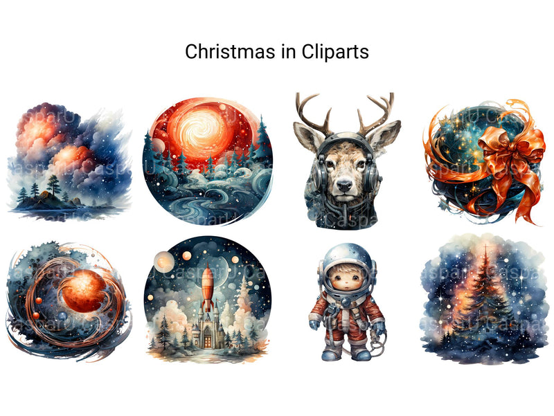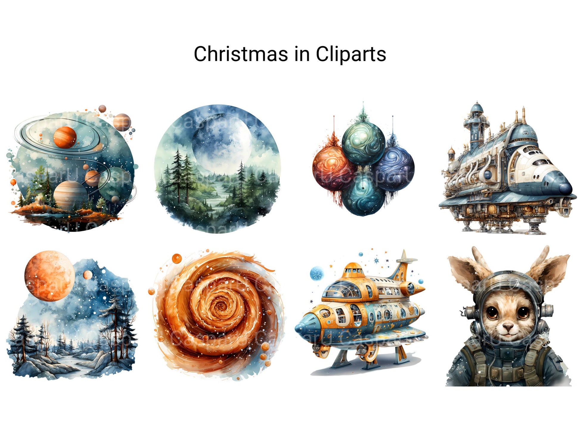 Transport your holiday celebrations to another dimension with our Space Christmas clip art. These digital illustrations blend cosmic wonders with festive cheer, featuring astronauts, rockets, and planets adorned with holiday decorations, perfect for adding a touch of intergalactic magic to your Christmas designs, whether for cards, decorations, or sci-fi enthusiasts looking to celebrate the holidays among the stars.
