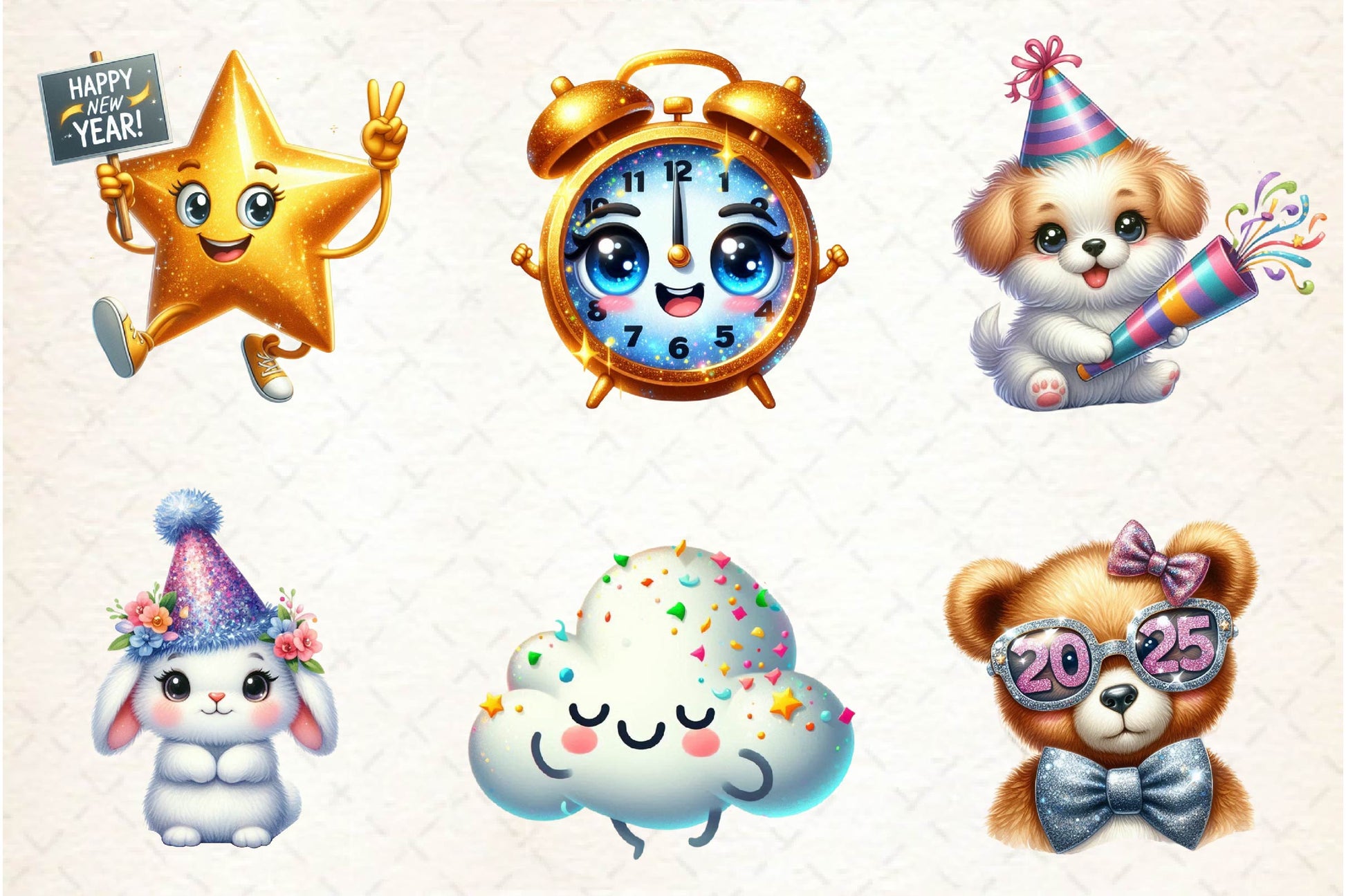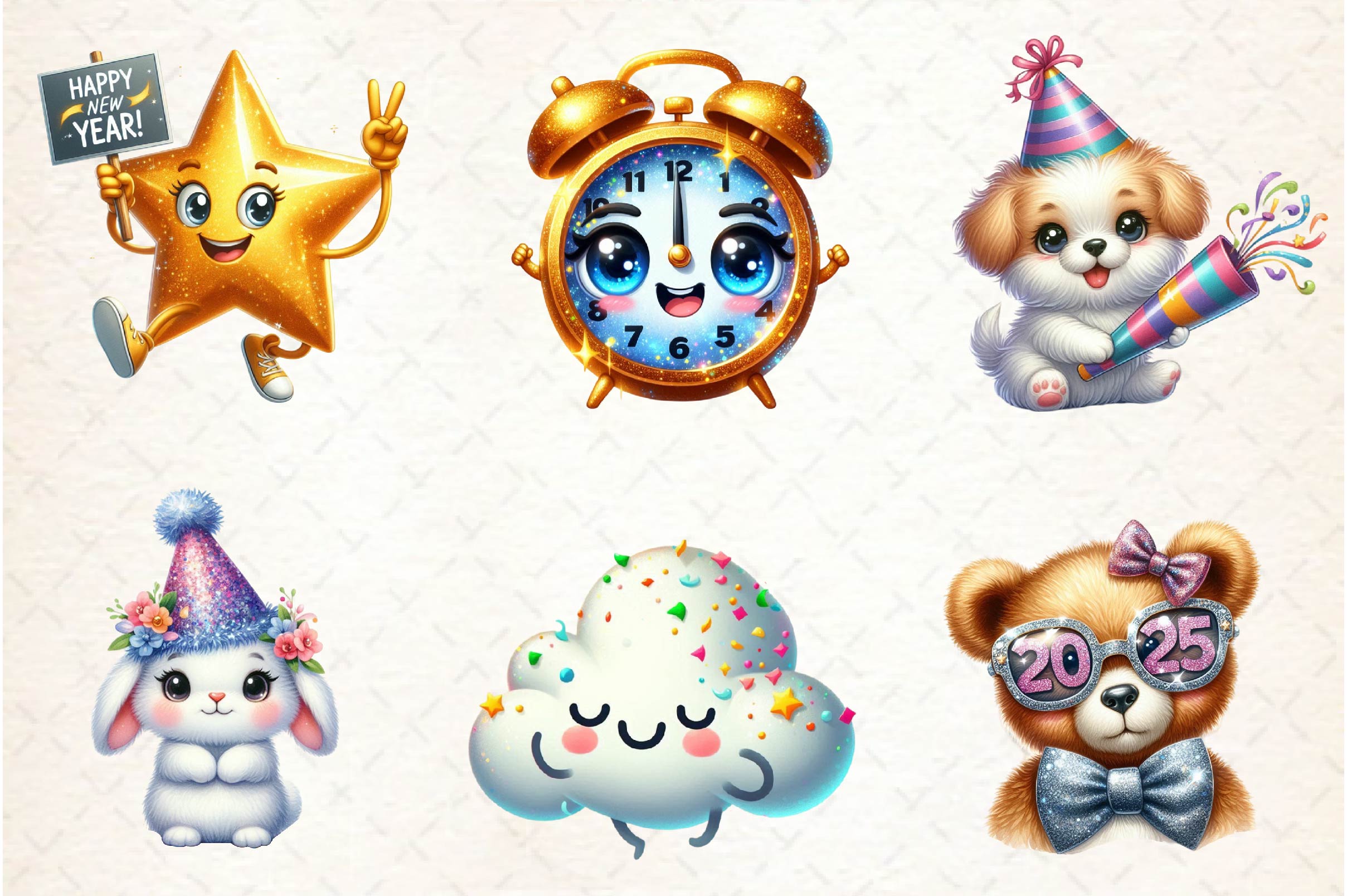 Shine with this Sparkling New Year Character Clipart Bundle, featuring glittery celebration designs, ideal for festive New Year crafts.