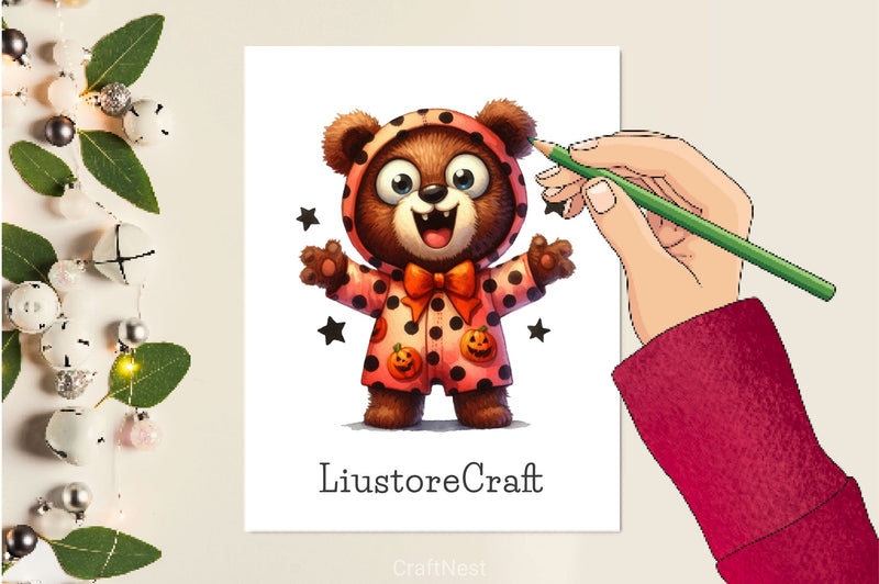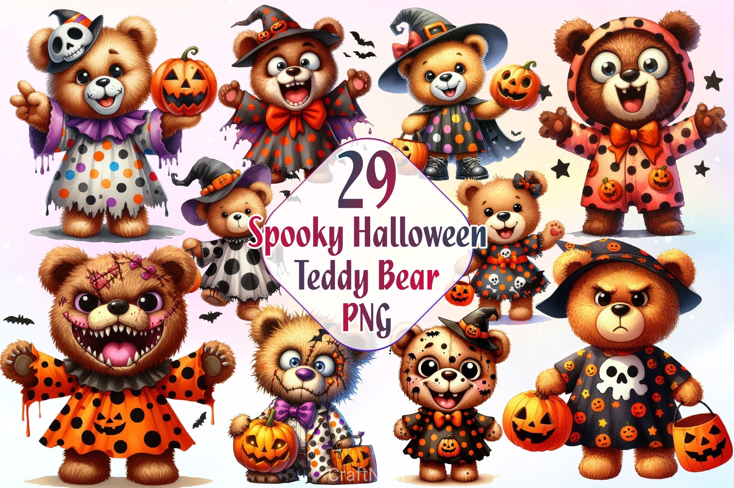 Cuddle with this Spooky Halloween Teddy Bear Clipart Bundle, featuring adorable spooky teddy designs, perfect for cute Halloween crafts.
