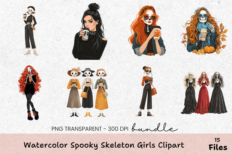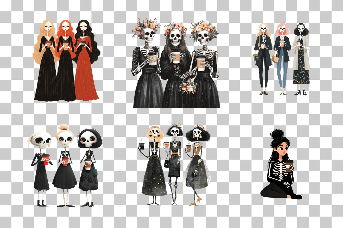 Unleash creativity with the Spooky Skeleton Girls Clipart Bundle, featuring hauntingly charming skeleton girl designs perfect for Halloween crafts, party invitations, and eerie decor projects.