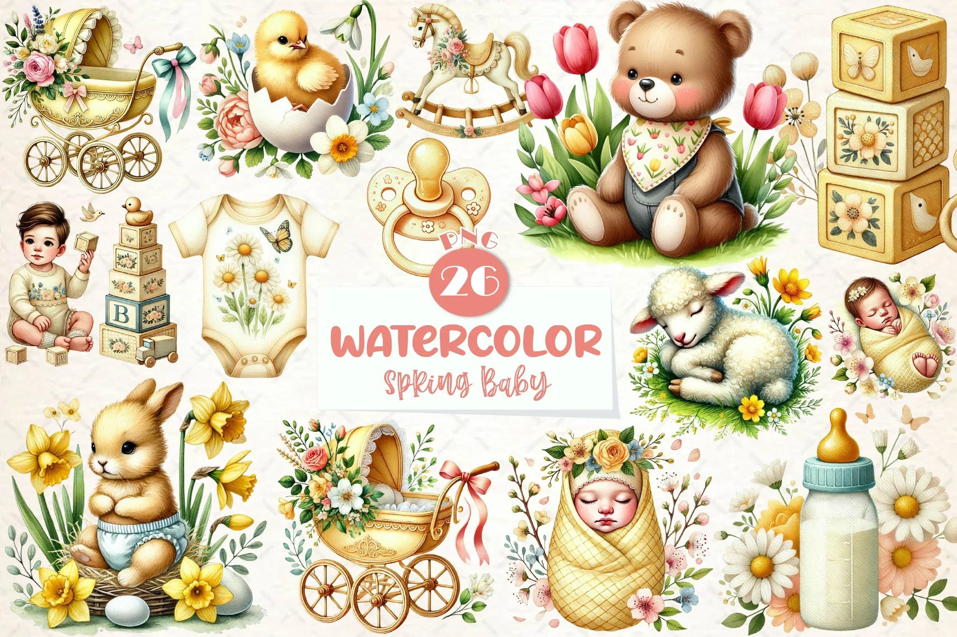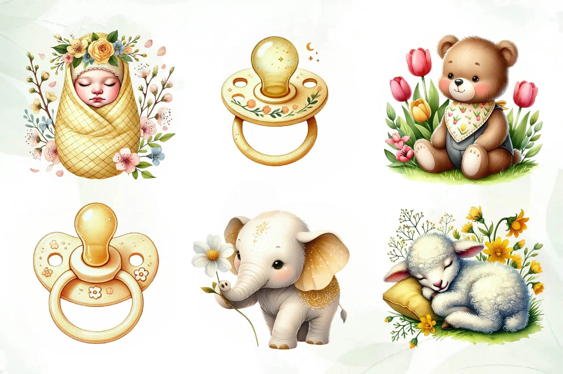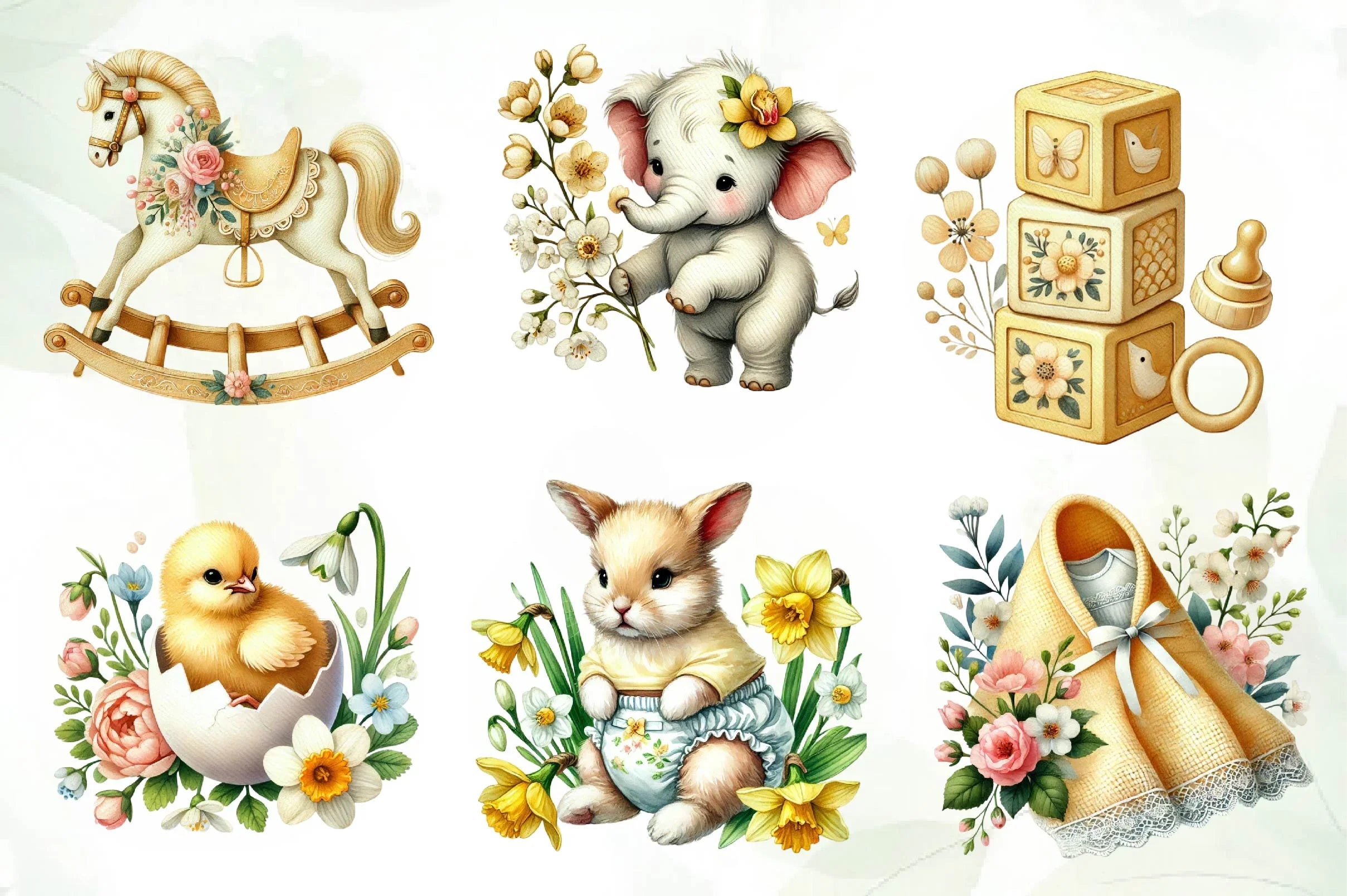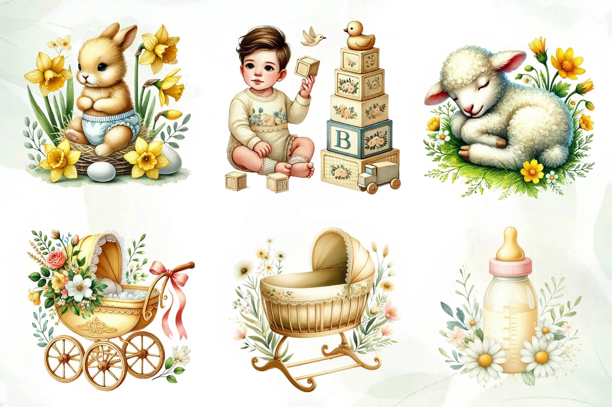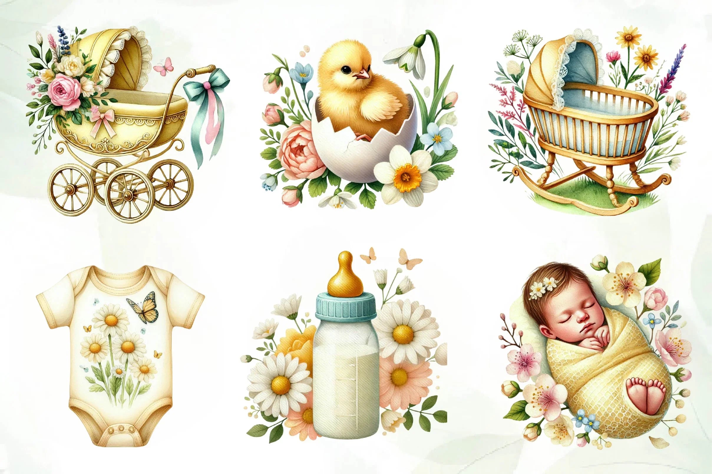 Delight in the Spring Baby Clipart Bundle, showcasing charming baby-themed illustrations perfect for seasonal crafts, invitations, and nursery decor projects.