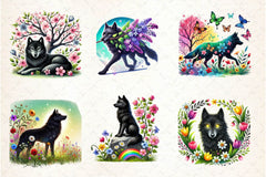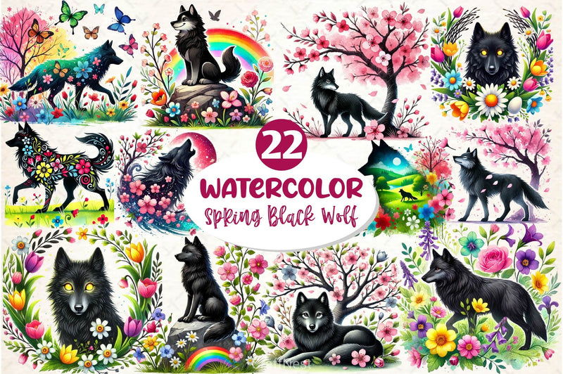 Spring Black Wolf Clipart Bundle 2