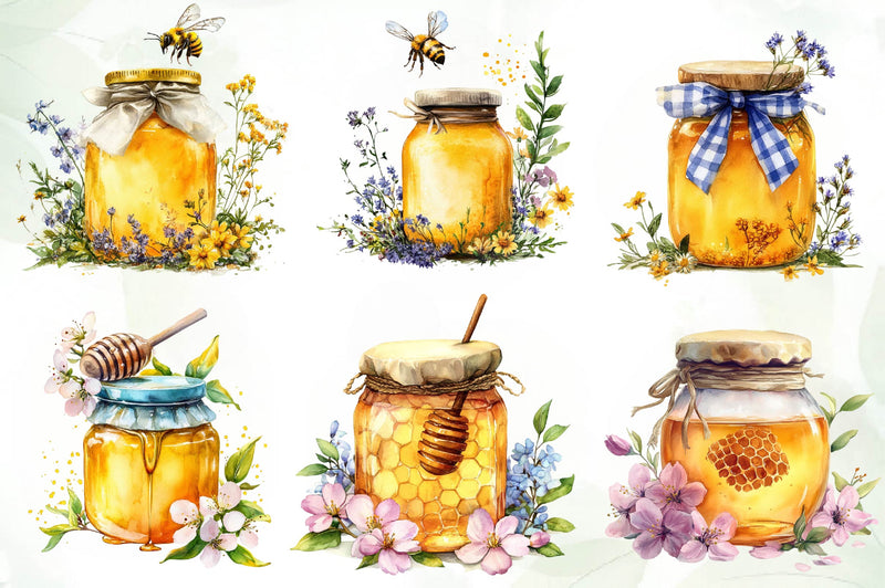 Sweeten with this Spring Honey Jar Clipart Bundle, featuring honey pot designs, perfect for gardening bee crafts.