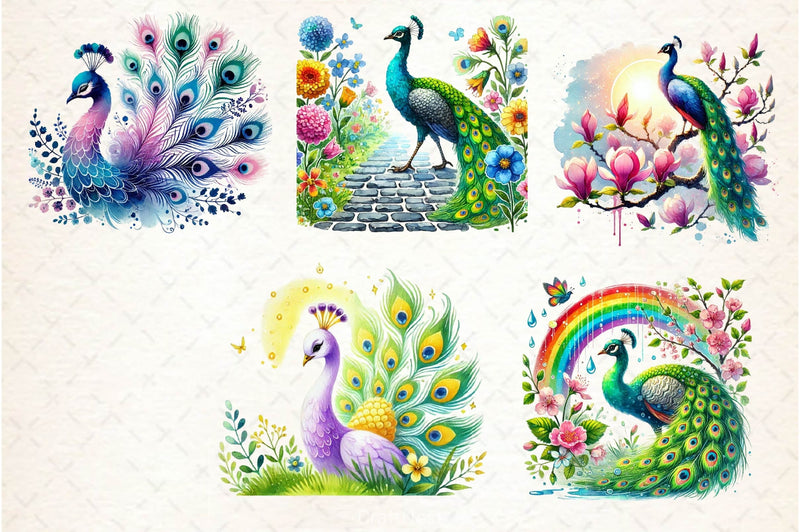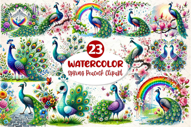 Strut with this Spring Peacock Clipart Bundle, featuring magnificent peacock designs, perfect for elegant spring bird crafts.