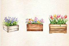 Plant with this Spring Wooden Planters Box Clipart Bundle, featuring rustic container designs, perfect for garden cultivation crafts.