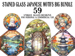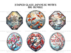 Immerse yourself in the rich heritage of Japan with our Stained Glass Japanese Motifs clip art. These elegant digital illustrations showcase traditional Japanese motifs rendered in the style of stained-glass, featuring cherry blossoms, koi fish, and intricate patterns, perfect for adding a touch of cultural richness and artistic beauty to your designs, whether for Japanese-themed events, cultural projects, or artistic expressions, honoring the timeless traditions of Japan in luminous hues and intricate designs.
