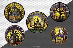 Beautiful stained glass spooky houses for artistic Halloween projects.