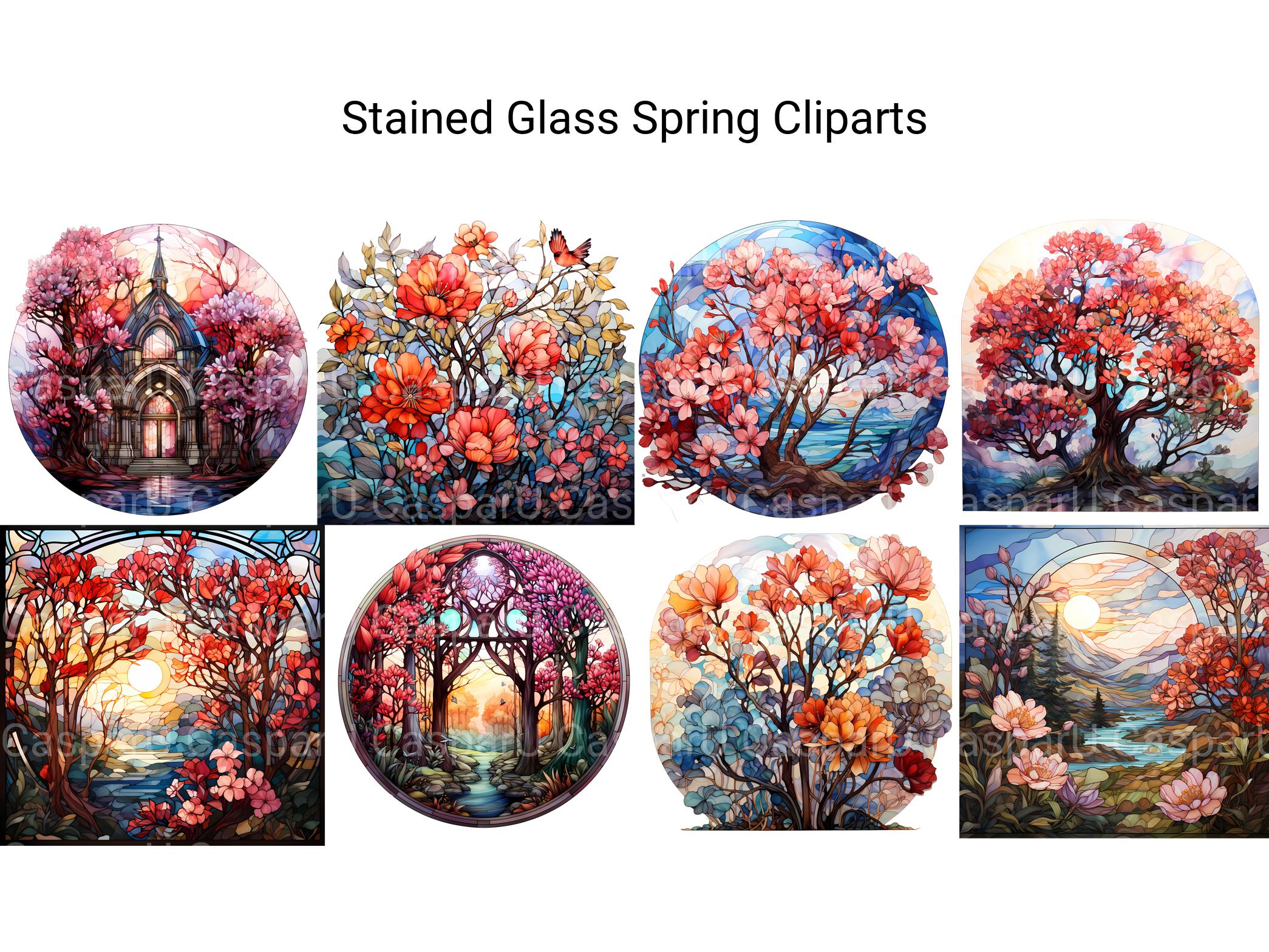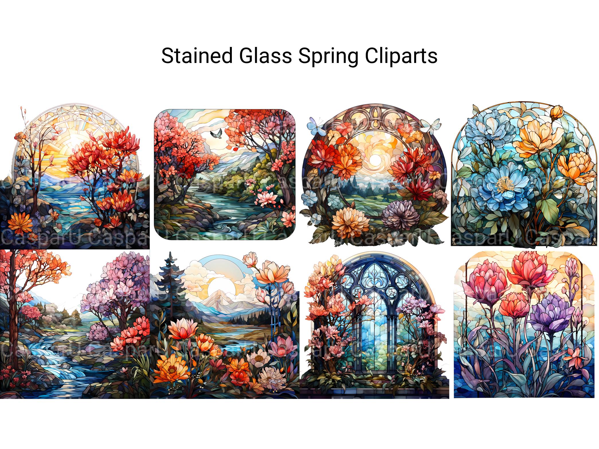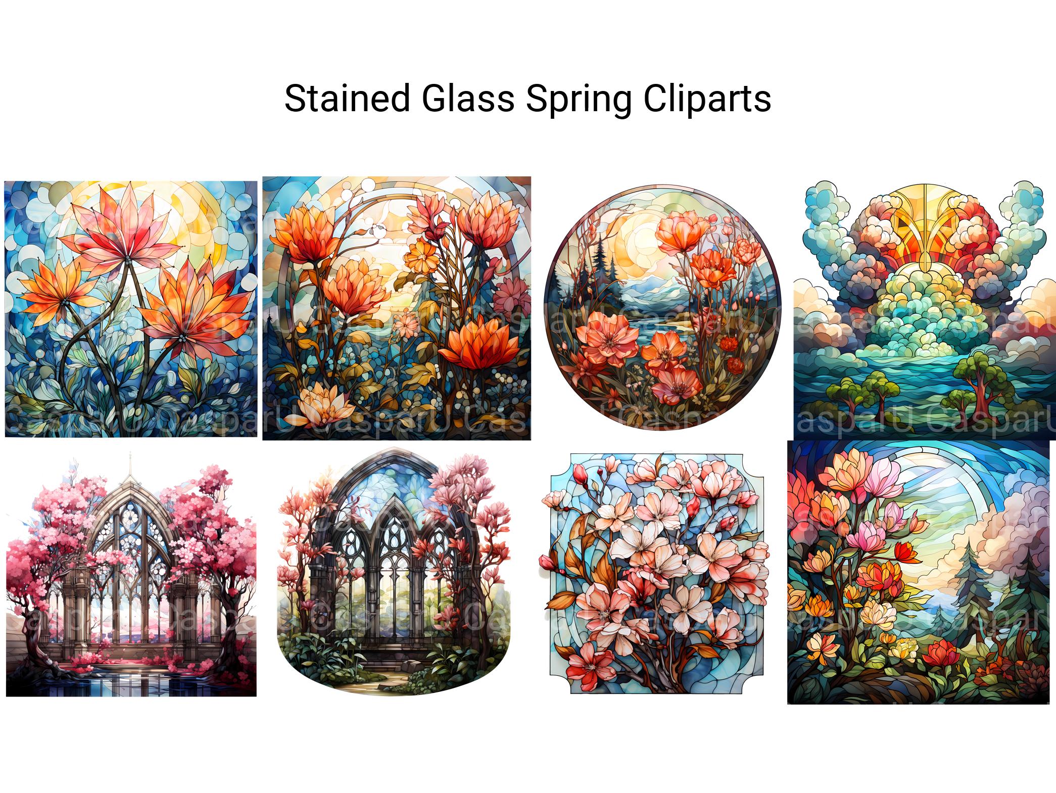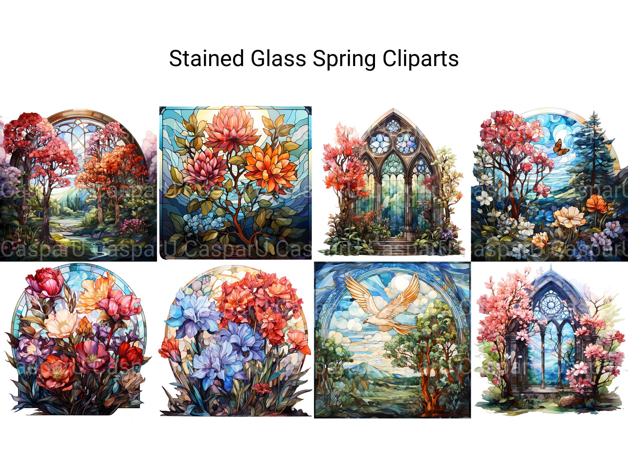 Illuminate your designs with the vibrant colors and elegant motifs of Stained Glass Spring digital clip art featuring intricate stained-glass designs inspired by springtime. From delicate florals to graceful butterflies, these stained-glass images capture the beauty and serenity of spring, perfect for adding a touch of stained-glass elegance to your projects. Let the luminous hues and intricate patterns of Stained Glass Spring infuse your designs with a sense of timeless beauty and stained-glass artistry.