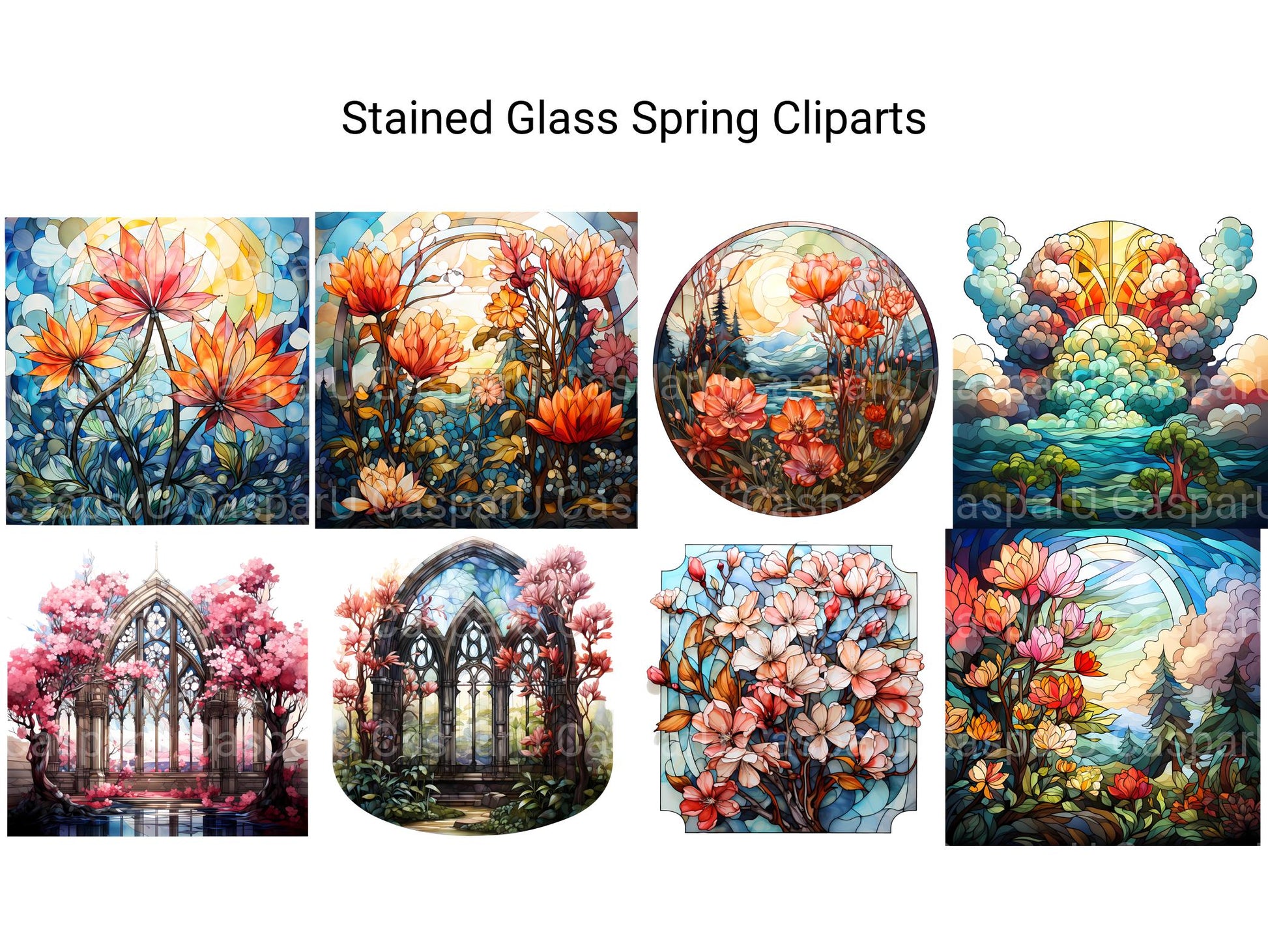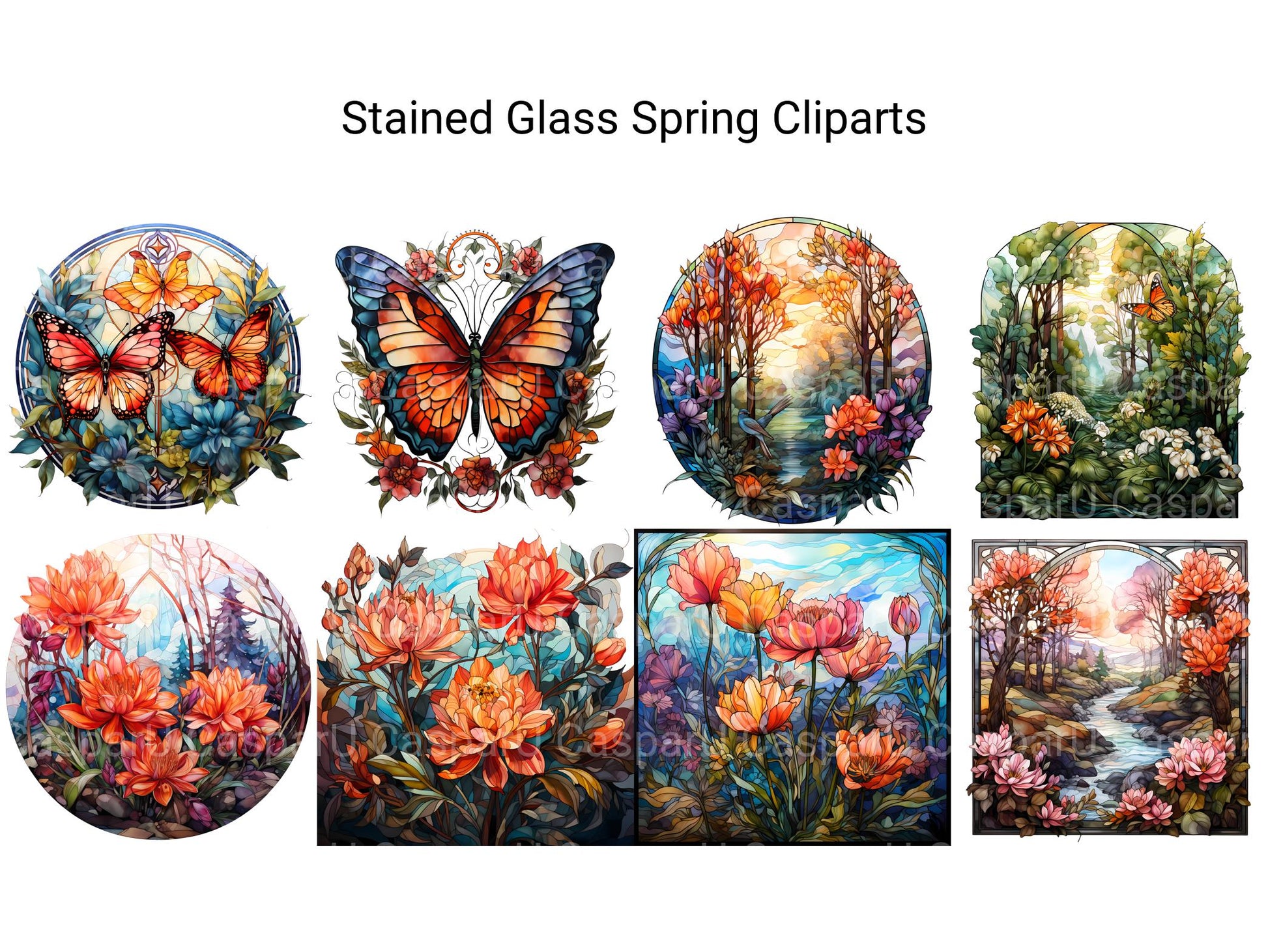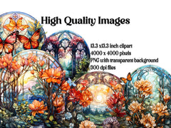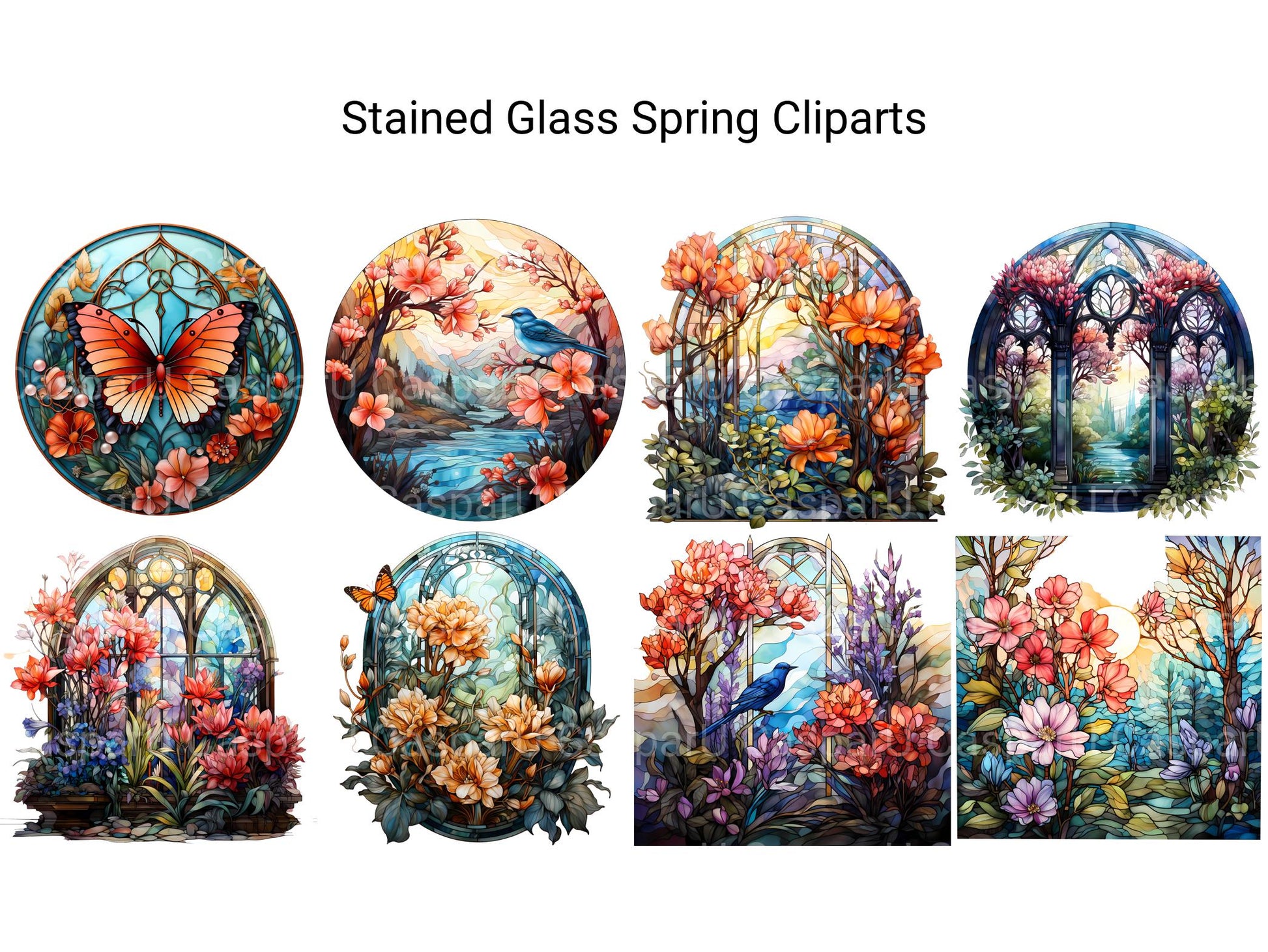 Illuminate your designs with the vibrant colors and elegant motifs of Stained Glass Spring digital clip art featuring intricate stained-glass designs inspired by springtime. From delicate florals to graceful butterflies, these stained-glass images capture the beauty and serenity of spring, perfect for adding a touch of stained-glass elegance to your projects. Let the luminous hues and intricate patterns of Stained Glass Spring infuse your designs with a sense of timeless beauty and stained-glass artistry.