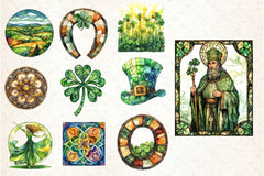 Lucky with this Stained Glass St Patricks Clipart Bundle, featuring Irish window designs, perfect for holiday glass crafts.