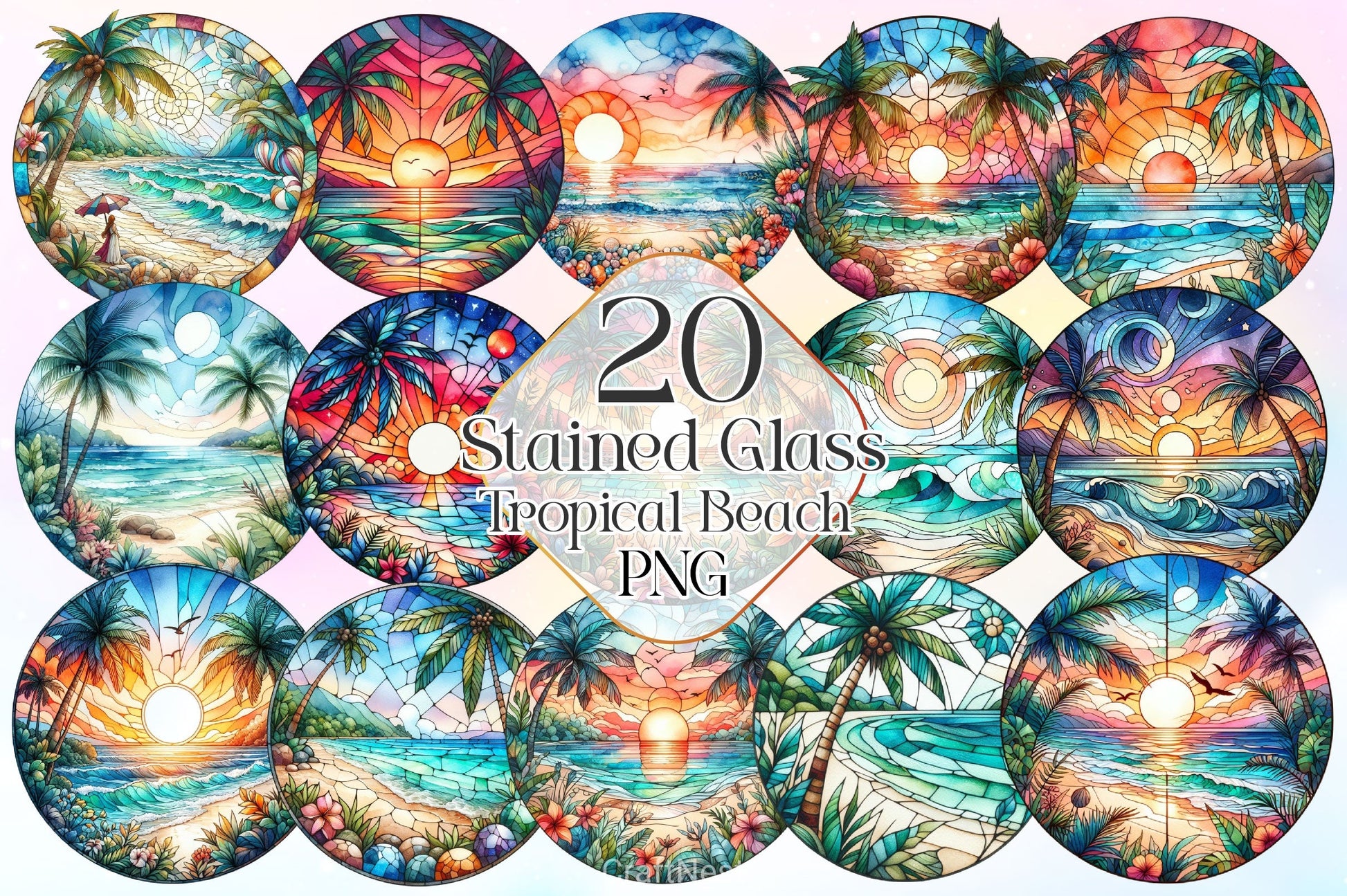 Paradise with this Stained Glass Tropical Beach Clipart Bundle, featuring colorful island window designs, perfect for beach glass crafts.