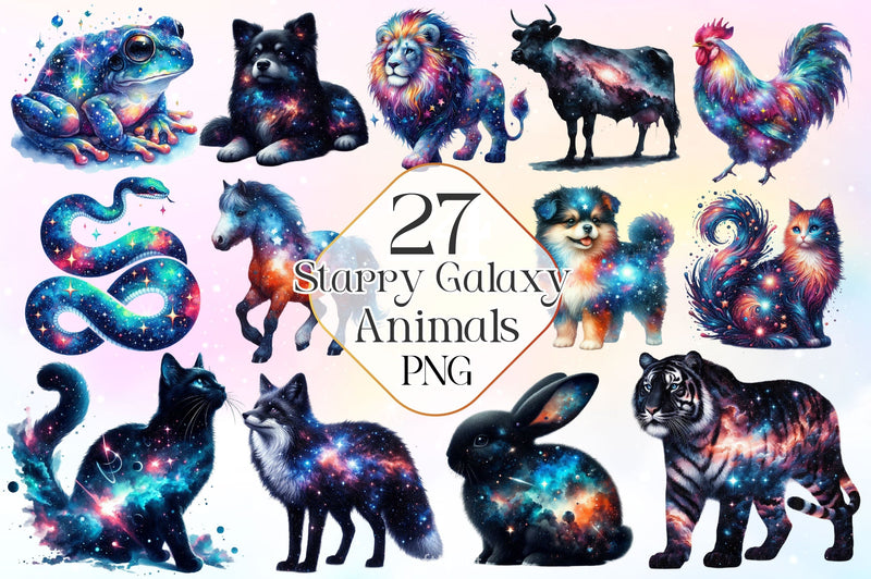 Animals in cosmic starry galaxy settings for space and nature projects.