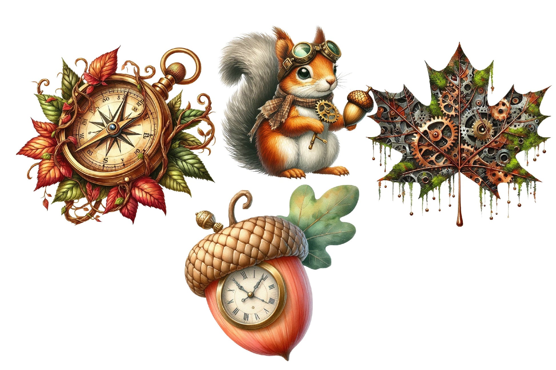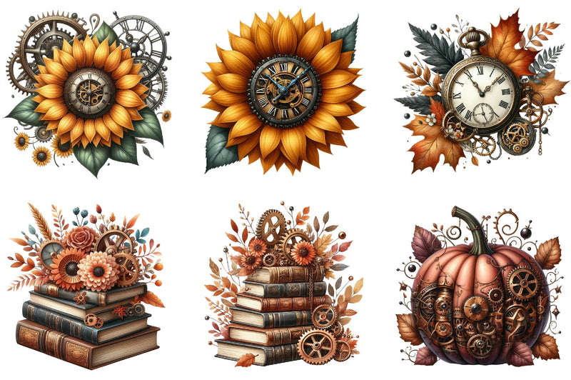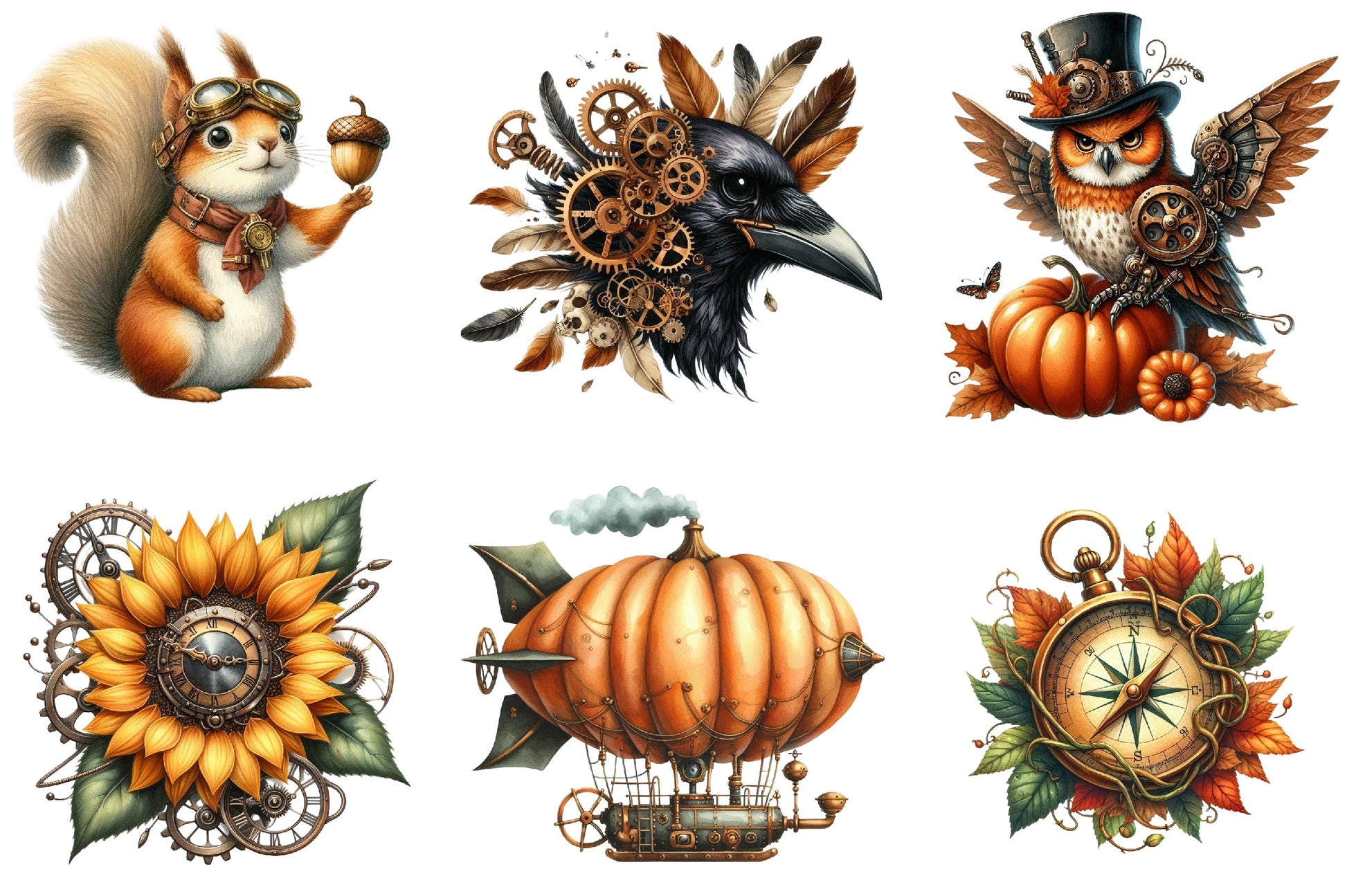 Explore the fusion of steampunk aesthetics and autumn charm with our versatile clipart bundle, designed to enhance your artistic projects with intricate details and seasonal flair.